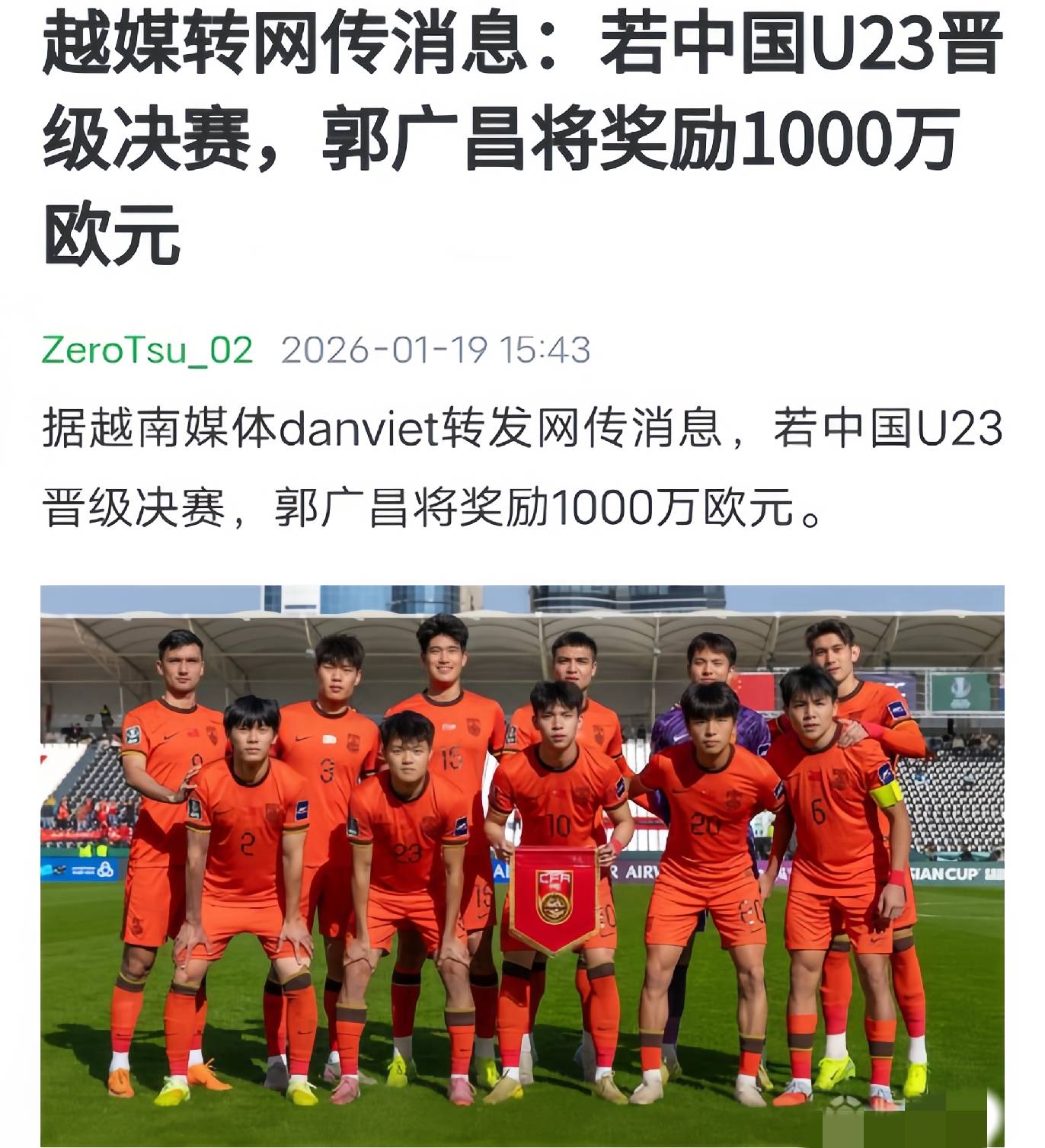 ตามรายงานจากสื่อกีฬาเวียดนาม DanViet ระบุว่า หากทีมชาติจีนชุดอายุต่ำกว่า 23 ปีสามารถเอาชนะทีมชาติเวียดนามชุดอายุต่ำกว่า 23 ปีเพื่อผ่านเข้าสู่รอบชิงชนะเลิศของศึกฟุตบอลชิงแชมป์เอเชียรุ่นอายุไม่เกิน 23 ปีได้ เจ้าของสโมสรฟุตบอลวูล์ฟแฮมป์ตัน วันเดอเรอร์ส ในพรีเมียร์ลีก อังกฤษ คุณกัว กวงชาง จะมอบรางวัลจำนวน 10 ล้านยูโร (ประมาณ 304.7 พันล้านดองเวียดนาม)วูล์ฟแฮมป์ตัน วันเดอเรอร์ส เป็นสโมสรฟุตบอลที่ถือครองโดยชาวจีนภายใต้กลุ่มฟอสัน โดยมีกัว กวงชาง ดำรงตำแหน่งประธานกลุ่ม อย่างไรก็ตาม ข้อกล่าวอ้างที่ว่านายกัวจะมอบเงิน 10 ล้านยูโรหากทีมชาติจีนชุดยู-23 เอาชนะเวียดนามและผ่านเข้าสู่รอบชิงชนะเลิศนั้น ยังไม่ได้รับการยืนยัน ไม่มีสำนักข่าวกีฬาหลักใดติดตามรายงานนี้เพิ่มเติม ซึ่งบ่งชี้ว่าข้อมูลดังกล่าวอาจเป็นเท็จ