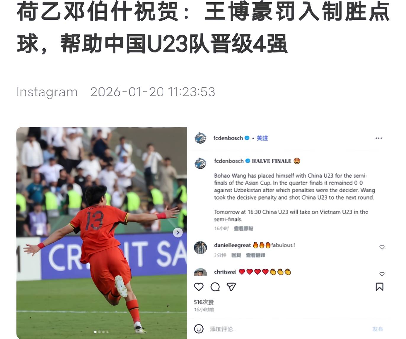 สโมสรฟุตบอลเดนบอชได้ออกแถลงการณ์อย่างเป็นทางการ: ขอแสดงความยินดีกับทีมชาติจีนชุดอายุไม่เกิน 23 ปี ที่ผ่านเข้าสู่รอบรองชนะเลิศของการแข่งขันฟุตบอลชิงแชมป์เอเชีย รุ่นอายุไม่เกิน 23 ปี ในระหว่างการแข่งขันยิงจุดโทษกับทีมชาติอุซเบกิสถานชุดอายุไม่เกิน 23 ปี นักเตะของเรา หวัง โบฮาโอ (เดนบอช) ได้ยืนหยัดท่ามกลางความกดดันอย่างมหาศาลและยิงจุดโทษตัดสินได้อย่างยอดเยี่ยม นำชัยชนะมาสู่ทีมชาติจีนชุดอายุไม่เกิน 23 ปี และพาทีมเข้าสู่รอบรองชนะเลิศพวกเราที่เดน บอสช์ รู้สึกภาคภูมิใจอย่างยิ่งในตัวหวัง โบฮาโอ และหวังเป็นอย่างยิ่งว่าเขาและเพื่อนร่วมทีมทีมชาติจีนชุดยู-23 จะสามารถคว้าแชมป์เอเชียนคัพ รุ่นอายุไม่เกิน 23 ปีได้สำเร็จ