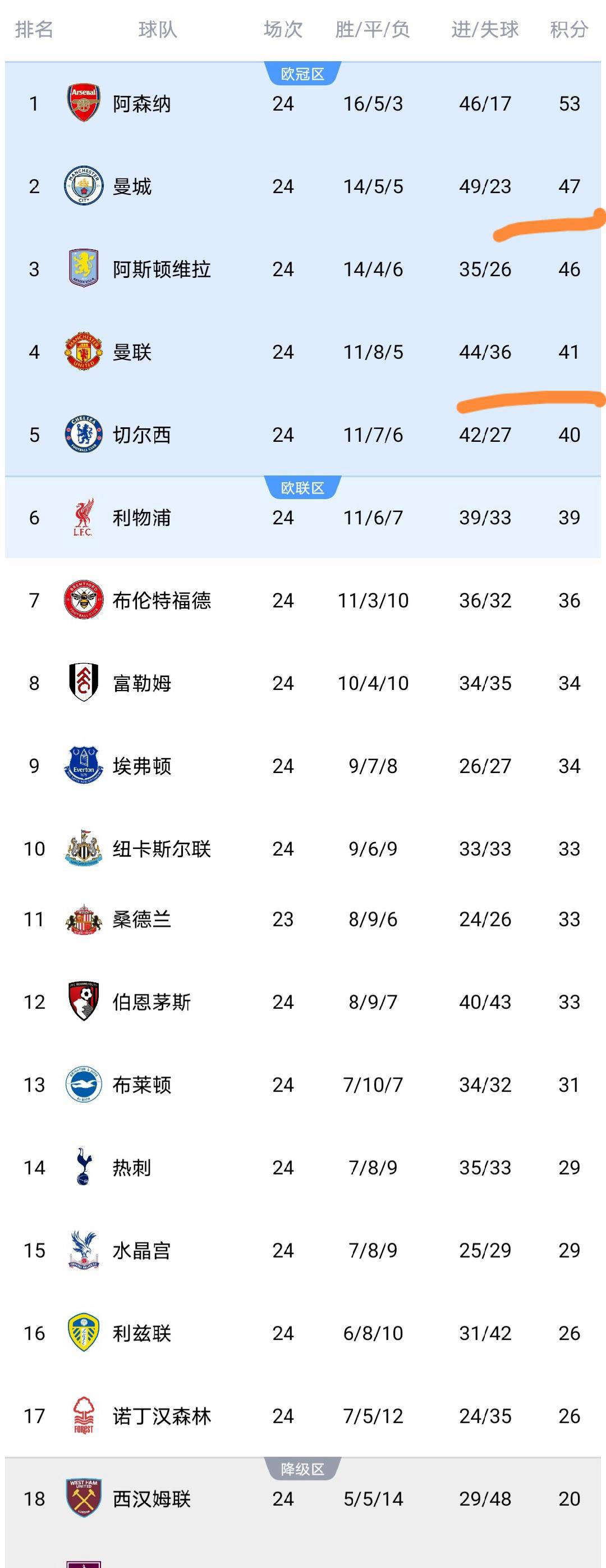 แมนเชสเตอร์ ยูไนเต็ด คว้าสามแต้มสำคัญในรอบนี้ ด้วยการเอาชนะฟูแล่ม 3-2 ทำให้มีคะแนนสะสมเพิ่มเป็น 41 คะแนน และยังคงครองอันดับสี่อย่างเหนียวแน่น พร้อมรักษาการควบคุมตำแหน่งการผ่านเข้ารอบแชมเปียนส์ลีกไว้ได้ หากพวกเขารักษาฟอร์มการเล่นที่ดีเช่นนี้ต่อไป ทีมปีศาจแดงสามารถคาดหวังได้ว่าจะได้ลุ้นชิงตำแหน่งการผ่านเข้ารอบแชมเปียนส์ลีกในฤดูกาลหน้าท็อตแน่ม ฮ็อตสเปอร์ เก็บได้หนึ่งคะแนน ทำให้มีคะแนนสะสมเป็น 29 คะแนน อยู่ในอันดับที่ 14 ของตารางกลาง. เบรนท์ฟอร์ด หลังจากเอาชนะแอสตัน วิลล่า ได้แล้ว ตอนนี้มีคะแนนสะสมเป็น 36 คะแนน ตามหลังเชลซีที่อยู่ในอันดับที่ 5 อยู่เพียง 4 คะแนน และยังคงมีความหวังที่จะได้สิทธิ์ไปแข่งขันในรายการยุโรป.