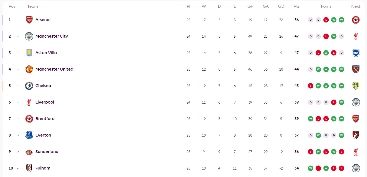 เมื่อวันที่ 8 กุมภาพันธ์ เวลาปักกิ่ง การแข่งขันหลายคู่ในรอบที่ 25 ของฤดูกาลพรีเมียร์ลีก 2025-26 ได้จบลงแล้ว โดยเหลือเพียงการแข่งขันระหว่างไบรท์ตันกับคริสตัล พาเลซ และลิเวอร์พูลกับแมนเชสเตอร์ ซิตี้ ที่ยังไม่ได้แข่งขัน อันดับตารางลีกมีดังนี้: