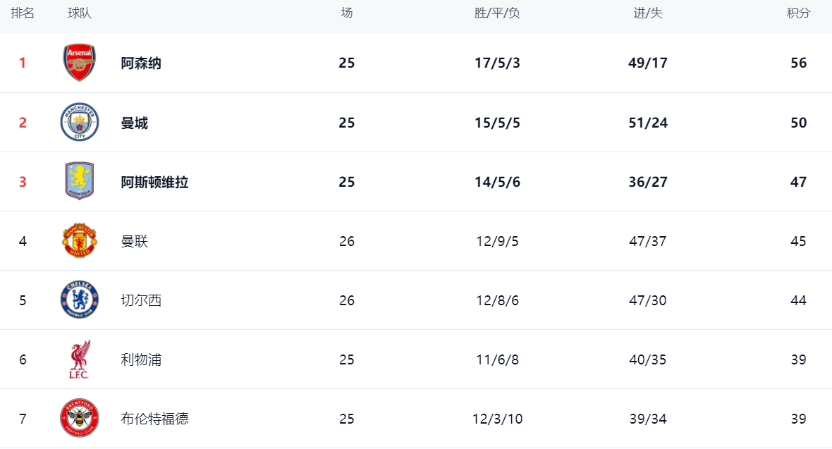 การแข่งขันเพื่อชิงตำแหน่งท็อปโฟร์กำลังดูวุ่นวายมากในขณะนี้ แอสตัน วิลล่า ซึ่งปัจจุบันอยู่อันดับสามด้วยคะแนน 47 แต้ม กำลังเผชิญกับการต่อสู้ที่ยากลำบากเพื่อคว้าแชมป์ หากพวกเขายังคงฟอร์มตกและทำคะแนนหล่นไปเรื่อย ๆ พวกเขาอาจถูกดันออกจากตำแหน่งแชมเปี้ยนส์ลีกได้ ส่วนแมนเชสเตอร์ ยูไนเต็ด แม้จะเสมอ แต่ก็ยังรักษาตำแหน่งที่สี่ไว้ได้ชั่วคราว คะแนนรวมของยูไนเต็ดอยู่ที่ 45 แต้ม ซึ่งทำให้พวกเขามีความได้เปรียบเล็กน้อยเหนือเชลซี
