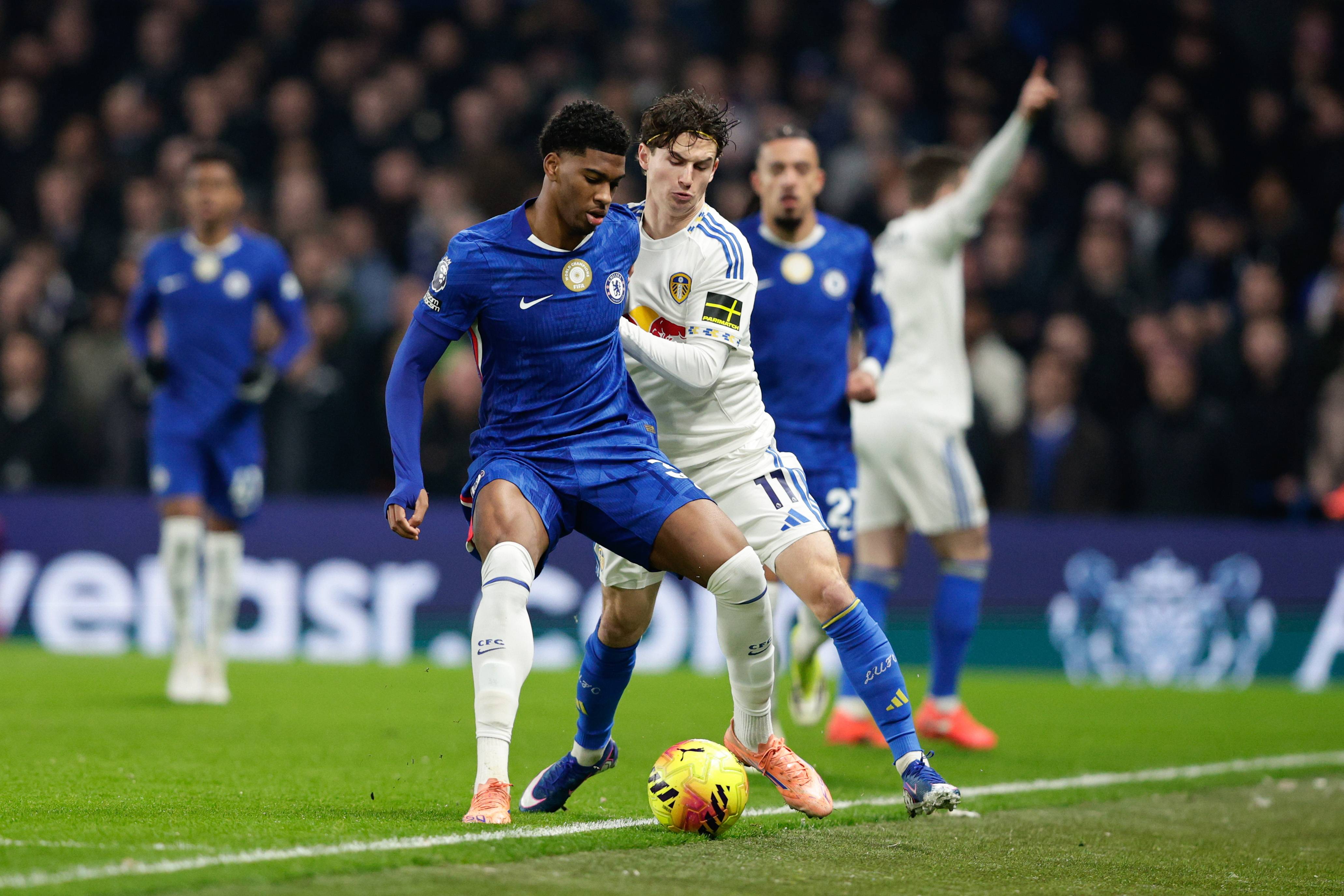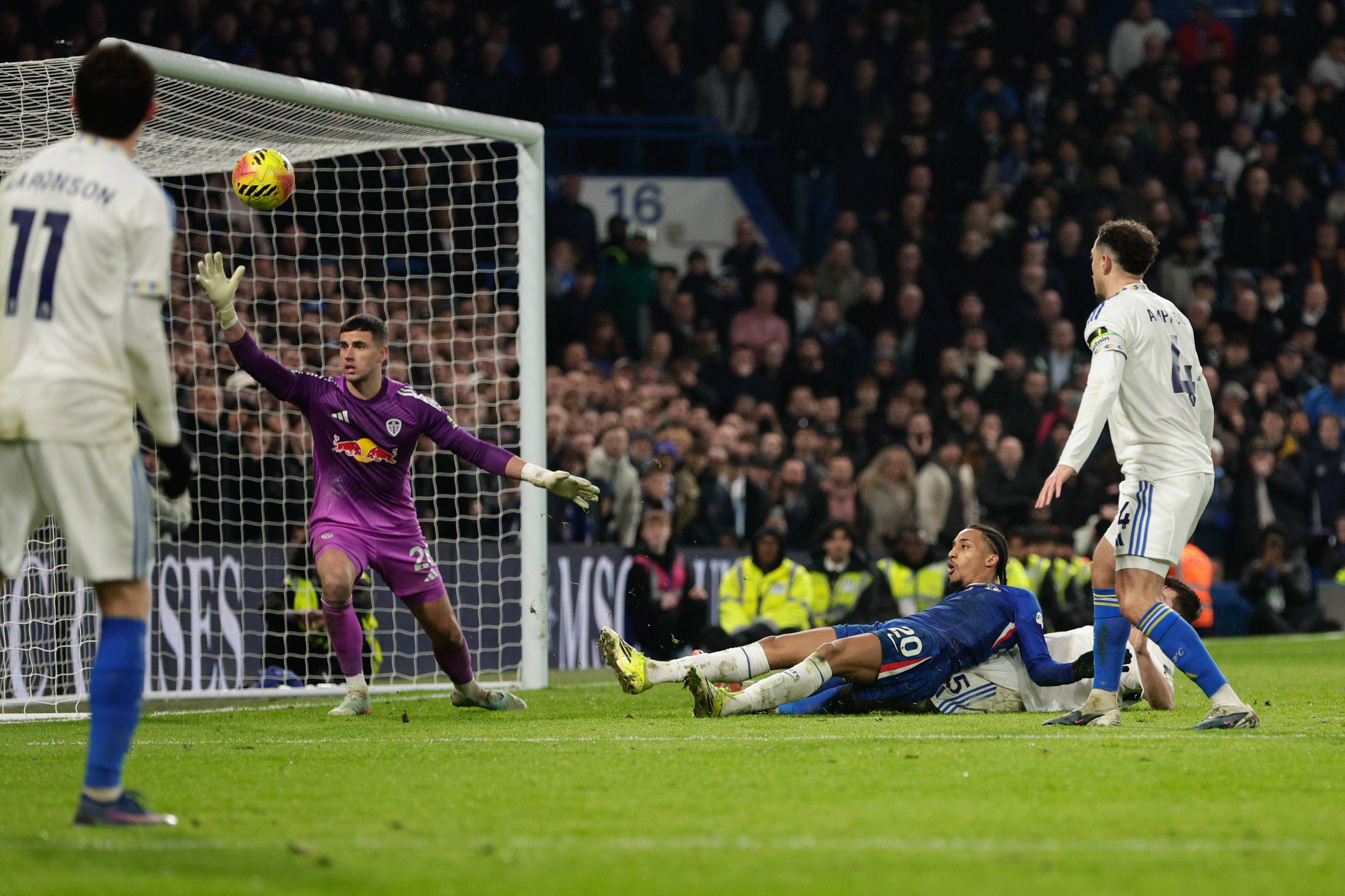 เมื่อวันที่ 10 กุมภาพันธ์ อากังเปา (ซ้าย) ของเชลซีท้าทายอารอนสันของลีดส์ ยูไนเต็ด เพื่อแย่งบอล. ซีเอ็นเอ็น/อีพีเอ