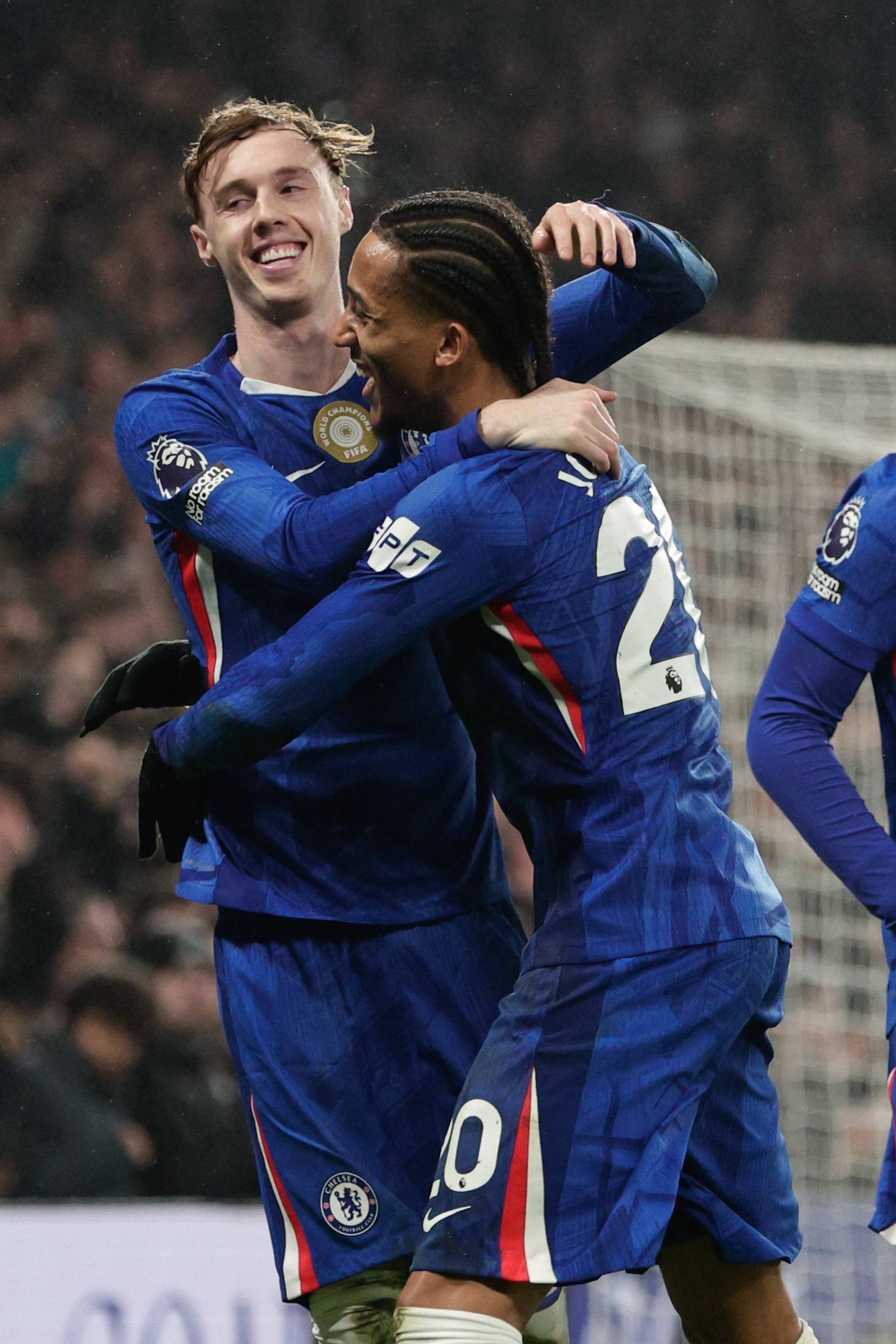 เมื่อวันที่ 10 กุมภาพันธ์ เมสัน พาลเมอร์ (ซ้าย) นักเตะเชลซี ฉลองการทำประตูที่สองของทีม Xinhua/EPA