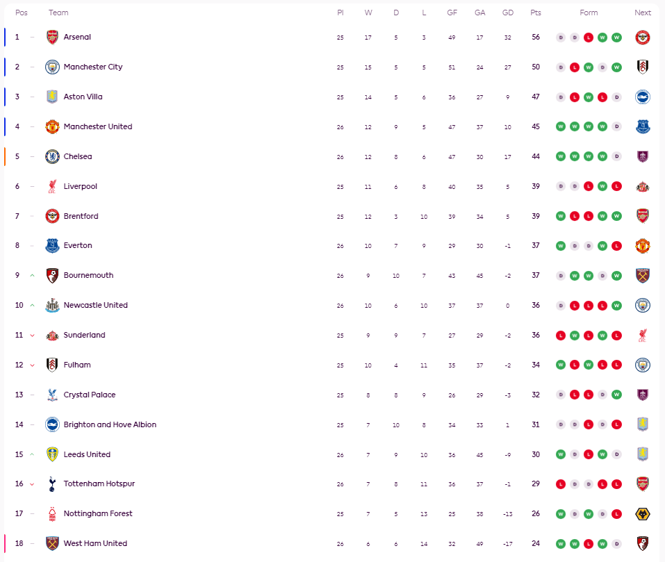 เมื่อวันที่ 11 กุมภาพันธ์ เวลาปักกิ่ง มีการแข่งขัน 4 คู่ในรอบที่ 26 ของพรีเมียร์ลีก โดยอันดับในลีกเป็นดังนี้: