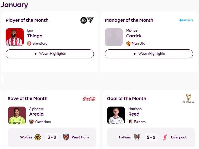 เมื่อไม่กี่นาทีที่ผ่านมา พรีเมียร์ลีกได้ประกาศผู้ชนะรางวัลประจำเดือนมกราคม โดยมีแมนเชสเตอร์ ยูไนเต็ดได้รับการเสนอชื่อเข้าชิงรางวัลครบทั้งสี่สาขา อย่างไรก็ตาม มีเพียงไมเคิล คาร์ริคเท่านั้นที่คว้าชัยชนะในฐานะผู้จัดการทีมยอดเยี่ยมประจำเดือน ขณะที่โดกัน, คูนญ่า และลาเมนส์ต่างจบลงด้วยการเป็นรองชนะเลิศ เมื่อย้อนกลับไปดูรางวัลประจำเดือนที่คาร์ริคเคยได้รับเมื่อหลายปีก่อน ผลลัพธ์ในครั้งนั้นกลับกลายเป็นเรื่องเศร้าอย่างยิ่ง