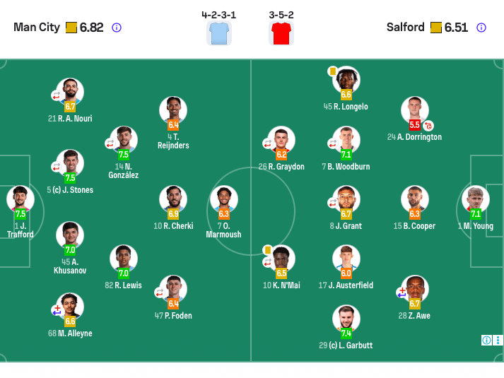 ซอลฟอร์ด ซิตี้ ตัวจริง: 1-แมทธิว ยัง, 15-แบรนดอน คูเปอร์, 24-ดอร์ริงตัน, 28-แซค เอบ (80' 16-โบรีนี), 45-แลงลูอิส, 7-วูดเบิร์น (80' 18-บัตเชอร์), 8-แกรนท์ (70' 4-แอชลีย์),10-เคลลี่ เอ็น'เมย์ (70' 23-อูดู), 17-ออสฟิลด์, 26-ไรอัน เกรย์ตัน (85' 25-เอสชาบติ-อูมฮาน), 29-กาบัตต์.