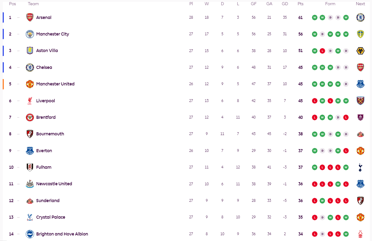 เมื่อวันที่ 23 กุมภาพันธ์ เวลาปักกิ่ง การแข่งขันพรีเมียร์ลีก รอบที่ 27 ได้สิ้นสุดลงแล้ว โดยเหลือเพียงการแข่งขันระหว่างเอฟเวอร์ตันกับแมนเชสเตอร์ยูไนเต็ดเท่านั้น อันดับตารางคะแนนพรีเมียร์ลีกมีดังนี้:
