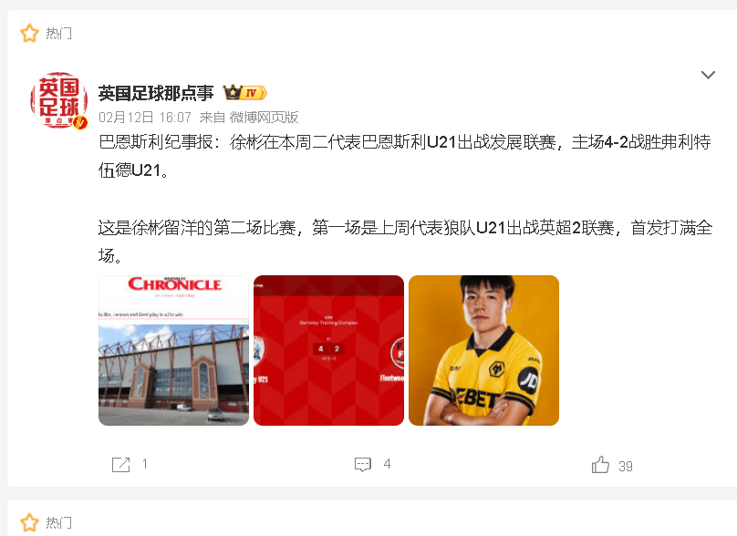 แม้ว่า Xu Bin จะเข้าร่วมทีม Wolverhampton Wanderers ในพรีเมียร์ลีก แต่เขาถูกปล่อยยืมตัวไปยังทีม Barnsley รุ่นอายุไม่เกิน 21 ปีในลีกวันเพื่อให้ได้เวลาเล่นที่สม่ำเสมอ พวกเขาคว้าชัยชนะอย่างหวุดหวิด 2-0 ในเกมเยือนกับทีม Huddersfield Town รุ่นอายุไม่เกิน 21 ปี โดย Xu Bin ได้รับความไว้วางใจจากผู้จัดการทีมให้ลงเป็นตัวจริงและเล่น 70 นาที ทำผลงานได้อย่างน่าชื่นชมนี่เป็นการเริ่มต้นติดต่อกันเป็นครั้งที่สองในรอบสัปดาห์ ซึ่งแสดงให้เห็นถึงความสำคัญที่เพิ่มขึ้นของเขาในทีม และความไว้วางใจที่เขามีต่อเขา หากเขายังคงรักษาระดับความสม่ำเสมอเช่นนี้ไว้ได้ แล้วทำไมผลงานของเขาจะไม่ดีขึ้นล่ะ?