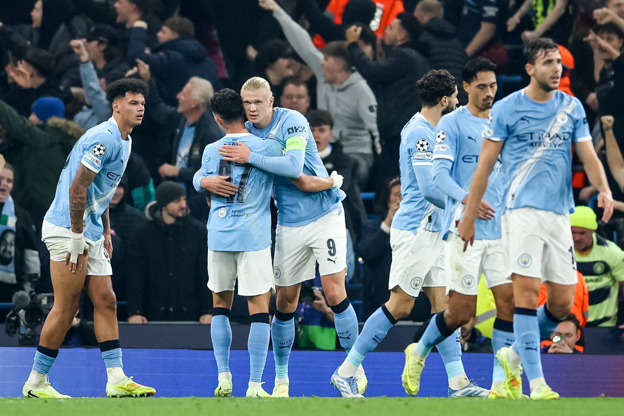 เมื่อวันที่ 5 พฤศจิกายน เออร์ลิง ฮาแลนด์ (คนที่สามจากซ้าย) นักเตะแมนเชสเตอร์ ซิตี้ ฉลองกับเพื่อนร่วมทีมหลังจากทำประตูที่สองให้กับทีมของเขา สำนักข่าวซินหัว/EPA