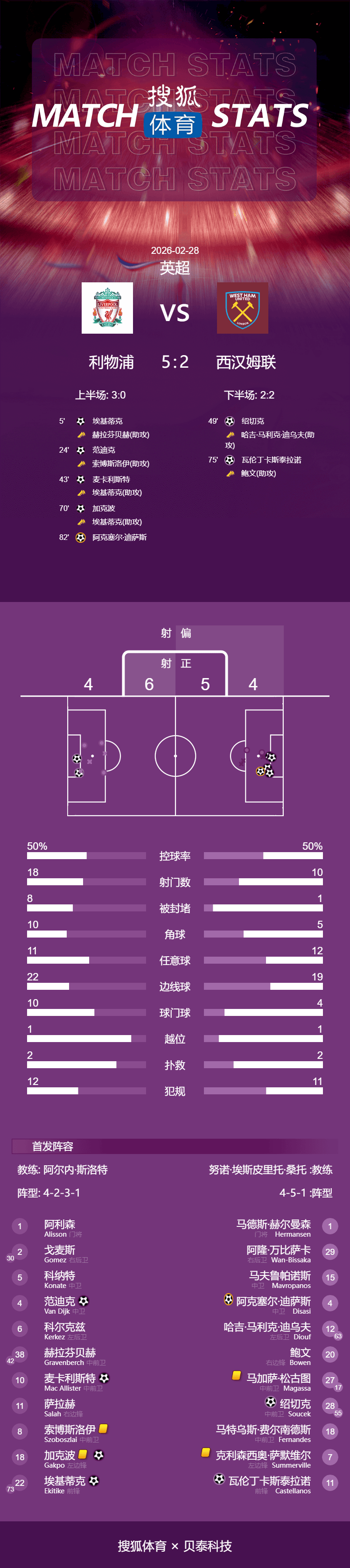 เวลา 23:00 น. ตามเวลาปักกิ่ง วันที่ 28 กุมภาพันธ์ ฤดูกาลพรีเมียร์ลีก 2025-26 ได้ดำเนินต่อไปกับนัดที่ 28 ลิเวอร์พูลเปิดบ้านรับการมาเยือนของเวสต์แฮม ยูไนเต็ด ที่สนามแอนฟิลด์ โดยสามารถเอาชนะไปได้ 5-2 ทำให้พวกเขามีสถิติชนะติดต่อกันในลีกเป็นนัดที่ 3 ผลการแข่งขันนี้ทำให้พวกเขาก้าวขึ้นไปอยู่ในอันดับที่ 5 แซงหน้าเชลซี และเสมอกับแมนเชสเตอร์ ยูไนเต็ด ที่อยู่ในอันดับที่ 4 ด้วยคะแนนเท่ากันเอคิติเก้เปิดสกอร์ได้ภายในห้านาทีแรก ก่อนที่ฟาน ไดจ์คจะเพิ่มประตูที่สองในนาทีที่ 24 แม็คอัลลิสเตอร์ทำประตูที่สามจากการแอสซิสต์ของเอคิติเก้ก่อนหมดครึ่งแรกเล็กน้อย โซเซคไล่ตามมาหนึ่งประตูในนาทีที่ 49 ก่อนที่กัคโปจะยุติการไร้สกอร์เจ็ดนัดด้วยการทำประตูในนาทีที่ 70 ซึ่งได้รับการช่วยเหลือจากเอคิติเก้อีกครั้งคาสเตลลาโนสทำประตูที่สี่ให้กับเจ้าบ้าน ขณะที่ลูกครอสของเฟรงกี้ เดอ ยองก์นำไปสู่การทำเข้าประตูตัวเองของดิสซา ปิดสกอร์ของเกมนี้