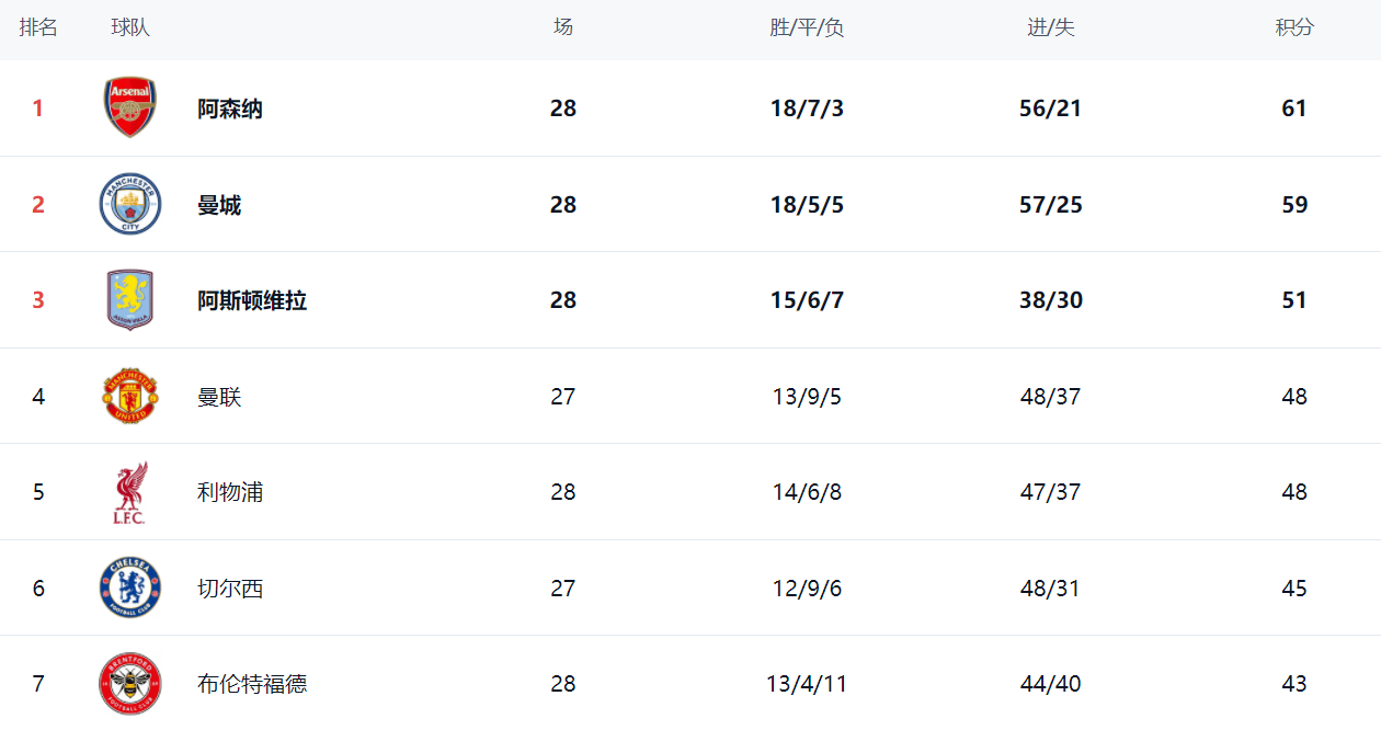 ในตารางลีก อาร์เซนอลยังคงครองตำแหน่งจ่าฝูงด้วยคะแนน 61 คะแนน จาก 18 ชัยชนะ 7 เสมอ และ 3 แพ้ แมนเชสเตอร์ ซิตี้ ซึ่งได้รับชัยชนะในนัดล่าสุด กำลังไล่ตามอย่างใกล้ชิด ซิตี้มีคะแนนรวม 59 คะแนน อยู่ในอันดับสอง ตามหลัง "ปืนใหญ่" เพียง 2 คะแนน การแข่งขันเพื่อชิงแชมป์กำลังดุเดือดอย่างมาก โดยซิตี้มีโอกาสที่จะขึ้นครองตำแหน่งจ่าฝูงในนัดต่อไปแอสตัน วิลล่า ยังคงสะดุดต่อไป อยู่ในอันดับสามด้วย 51 คะแนน แมนเชสเตอร์ ซิตี้ อยู่ในอันดับสี่ด้วย 48 คะแนน ลิเวอร์พูล หลังจากคว้าชัยชนะได้ ก็ยังคงมี 48 คะแนน อยู่ในอันดับห้า เชลซี ตกลงมาอยู่ในอันดับหก ด้วยคะแนนเพียง 45 คะแนน