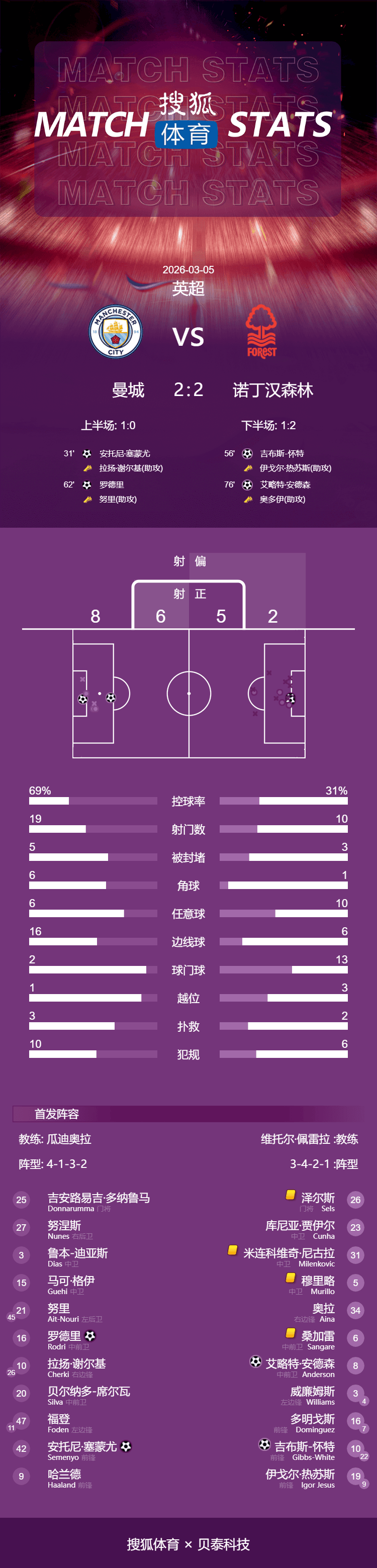 เมื่อเวลา 03:30 น. ของวันที่ 5 มีนาคม ตามเวลาปักกิ่ง รอบที่ 29 ของพรีเมียร์ลีกปี 2025-2026 ได้นำเข้าสู่การต่อสู้แบบโฟกัส และแมนเชสเตอร์ ซิตี้ เล่นในบ้านกับน็อตติงแฮม ฟอเรสต์ ในครึ่งแรก Shelkey ช่วยและ Semenio ยิงได้ ในครึ่งหลัง สกอร์ส้นเท้าของกิ๊บส์ ไวท์ ตีเสมอ นูรีเข้าโค้งและโรดรีทำแต้ม Odoi เล่นบอลและ Anderson ตีเสมออีกครั้งจากการยิงระยะไกล ในขั้นตอนการนับถอยหลัง เกิดความโกลาหลที่หน้าประตู และเส้นประตูของมูริเอลโลก็เคลียร์คีย์ ในท้ายที่สุด แมนเชสเตอร์ ซิตี้ เสมอ 2-2 ในบ้าน และสตรีคที่ชนะ 6 เกมในทุกการแข่งขันก็จบลง นอกจากนี้ในกรณีของเกมที่น้อยกว่าหนึ่งเกม เขาตามหลังอาร์เซนอล 7 แต้มที่อันดับต้น ๆ ของรายการ