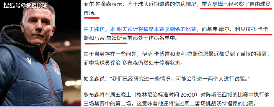 - 乔治·多布森: 中场绝对主力,因为在对阵切尔西的比赛中吃到红牌,本场比赛将继续执行他三场停赛的第二场。