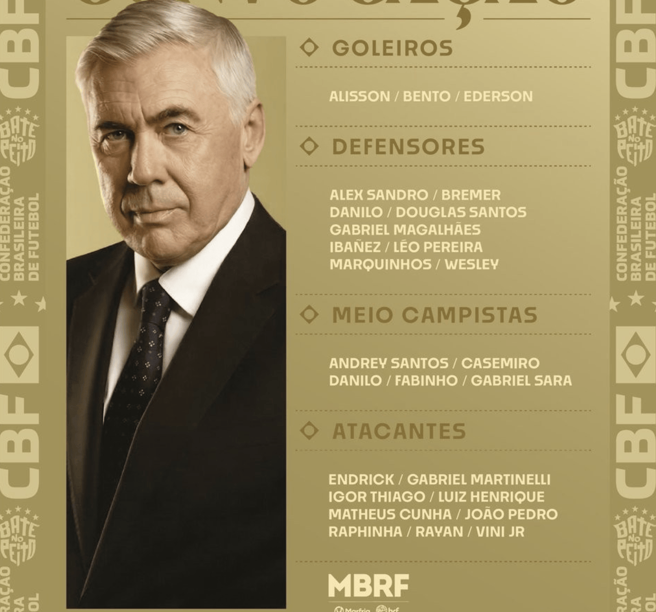 เมื่อเร็ว ๆ นี้ Ancelotti ได้ทำการตรวจสอบและวิเคราะห์ผู้เล่นที่โดดเด่นในบราซิลจำนวนมากในสถานที่ และในที่สุดก็ได้ระบุรายชื่อการแข่งขันที่เป็นมิตรล่าสุด ถือว่าเหลือเวลาอีกแค่สามเดือนเท่านั้นที่จะเริ่มการแข่งขันฟุตบอลโลกสหรัฐ-แคนาดา ได้เกือบทั้งหมด ในรายชื่อใหญ่นี้สามารถเข้าร่วมการแข่งขันฟุตบอลโลกได้