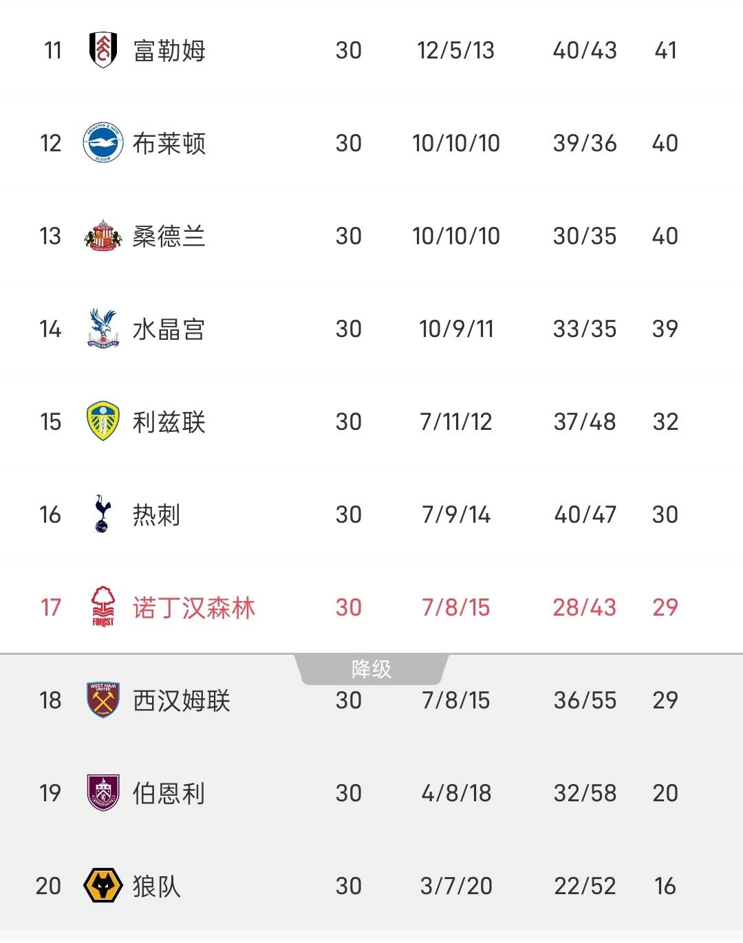 ในรอบที่ 30 ของพรีเมียร์ลีก วันที่ 16 มีนาคม ลิเวอร์พูล 1-1 โดย ท็อตแน่ม แมนเชสเตอร์ ยูไนเต็ด เอาชนะ แอสตัน วิลล่า 3-1, ฟูแล่ม 0-0 ดวน นอตติงแฮม ฟอเรสต์, คริสตัล พาเลซ 0-0 ลิซ ยูไนเต็ด, ล่าสุด พรีเมียร์ลีก ปล่อย, อาร์เซนอล 70 แต้ม 70 แต้ม, แมนเชสเตอร์ ซิตี้ โดยทั่วไปสามารถล็อค 61 แต้มที่สอง, แมนเชสเตอร์ ยูไนเต็ด ได้คะแนน 54 แต้มในคลื่นลูกสุดท้ายของสถิติชนะ และเกมสุดท้ายคือ 4 แต้ม และ 4 แต้ม
