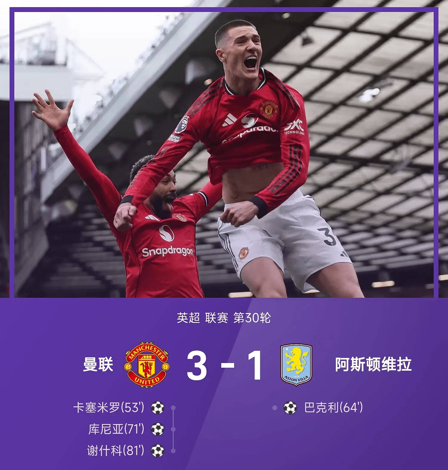 ในรอบ 30 ของพรีเมียร์ลีก ฤดูกาลที่ 25/26 แมนฯ ยูไนเต็ด เล่นแอสตัน วิลล่า ในบ้าน คาเซมิโร่ทำแต้มโหม่ง บาร์คลีย์ทำคะแนนให้เสมอกันในครั้ง บี ฟีช่วยทำคะแนนได้ 2 ครั้ง คูเนียยิงด้วยการยิงต่ำ และ Xieshko ทำประตูแทนเพื่อชัยชนะ ในท้ายที่สุด แมนเชสเตอร์ ยูไนเต็ด เอาชนะ แอสตัน วิลล่า 3-1 รั้งอันดับ 3 ในอันดับ