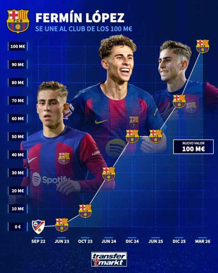 เฟอมิงโลเปซมีมูลค่า 50,000 ยูโรในเดือนกันยายน 2565 ภายในเดือนตุลาคม 2566 มูลค่าของเขาเพิ่มขึ้นเป็น 8 ล้านยูโร ในเดือนธันวาคม 2023 มูลค่าของเขาเพิ่มขึ้นเป็น 15 ล้านยูโร ในเดือนตุลาคม 2024 มูลค่าของเขาเพิ่มขึ้นเป็น 50 ล้านยูโร ในเดือนธันวาคม 2025 มูลค่าของเขาเพิ่มขึ้นเป็น 70 ล้านยูโร และตอนนี้เขามีมูลค่า 100 ล้านยูโร ในเวลาไม่ถึง 4 ปี คุณค่าของเขาเพิ่มขึ้นอย่างน่าทึ่ง!