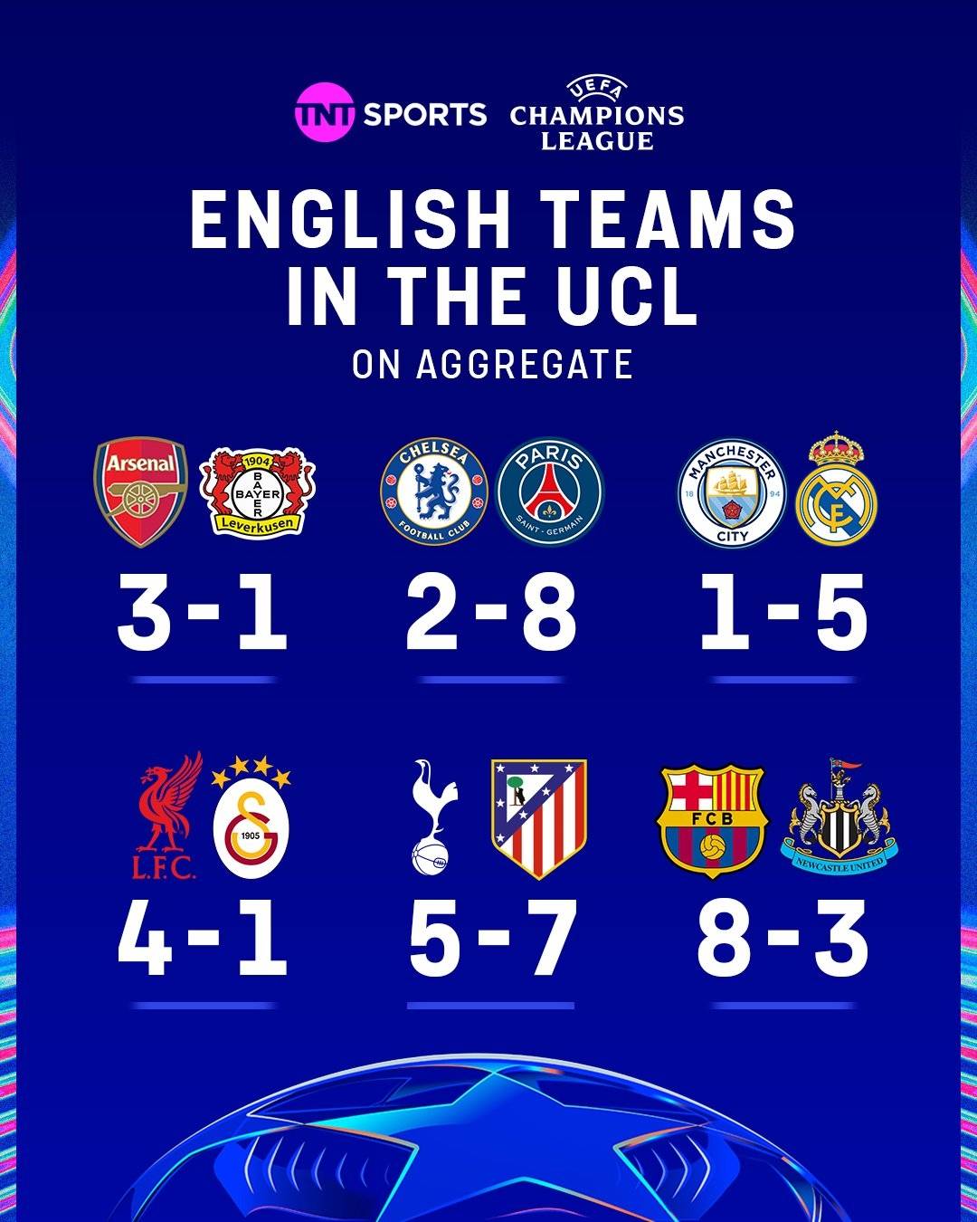 คะแนนรวมของ 1/8 รอบชิงชนะเลิศของพรีเมียร์ลีก 6 ทีม: อาร์เซนอล 3-1 เลเวอร์คูเซ่น แอดวานซ์, เชลซี 2-8 ปารีสดื่มลาฟิตออก, แมนฯ ซิตี้ 1-5 เรอัล มาดริด ออกต้นวันที่ 1 พฤษภาคม วันแรงงาน ลิเวอร์พูล 4-1 เทิร์น กาลาตาซาเร่ ท็อตแนม 5-7 บ้านชนะ ทีมรีเลคชั่นพรีเมียร์ลีก ยังคงรักษาหน้า ทีมลงสนาม 83 นัดที่ 83 ทีม ท็อตแนม 5-7 ชนะ ทีม รีเลคชั่น พรีเมียร์ลีก รักษาหน้า ทีม พรีเมียร์ลีก รักษาหน้า ทีม ยังคงรักษาหน้า ทีมลงสนาม 83 นัดที่ 83 นัดที่ 1 ลูก ท็อตแนม 5-7 ที่ได้ 5-7 ทีม ท็อตแนม ชนะ ทีม รีเลคชั่น พรีเมียร์ลีก รักษาหน้า ทีม พรีเมียร์ลีก รักษาหน้า ทีม ยังคงรักษาหน้า