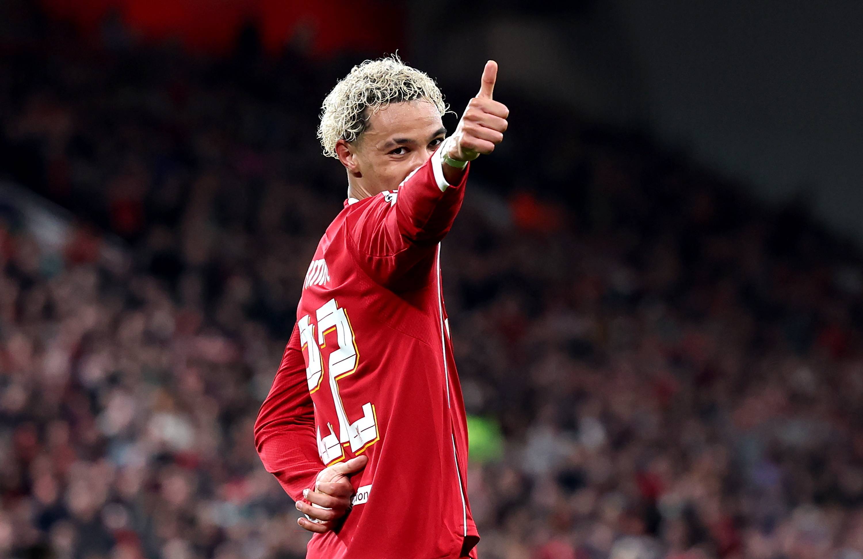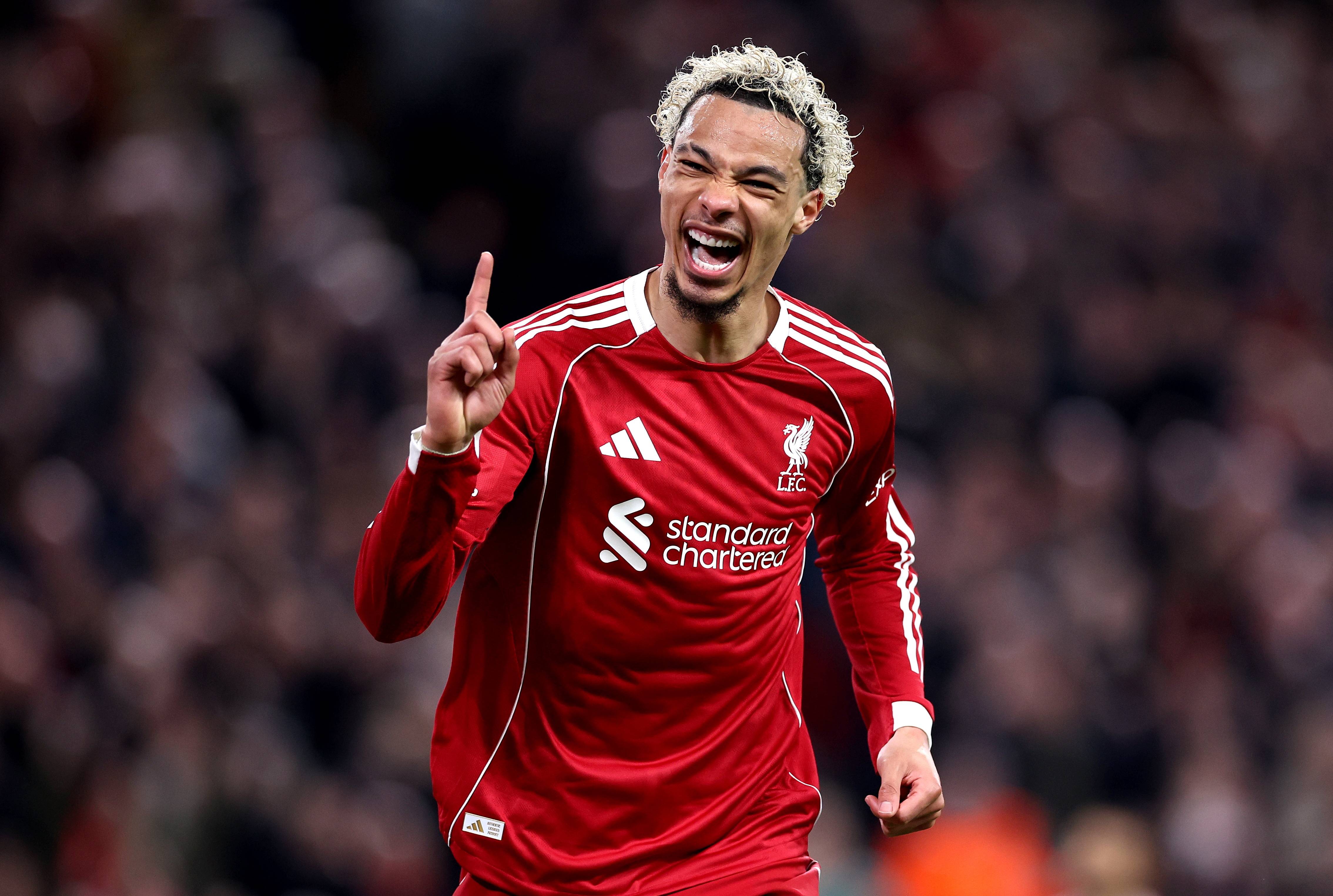 เมื่อวันที่ 18 มีนาคม ผู้เล่นทีมลิเวอร์พูล Ekitik (ขวา) ยิงประตูที่สองของทีมหลังจากฉลองกับ McCallister เพื่อนร่วมทีมของเขา สำนักข่าวซินหัว/OU XIN
