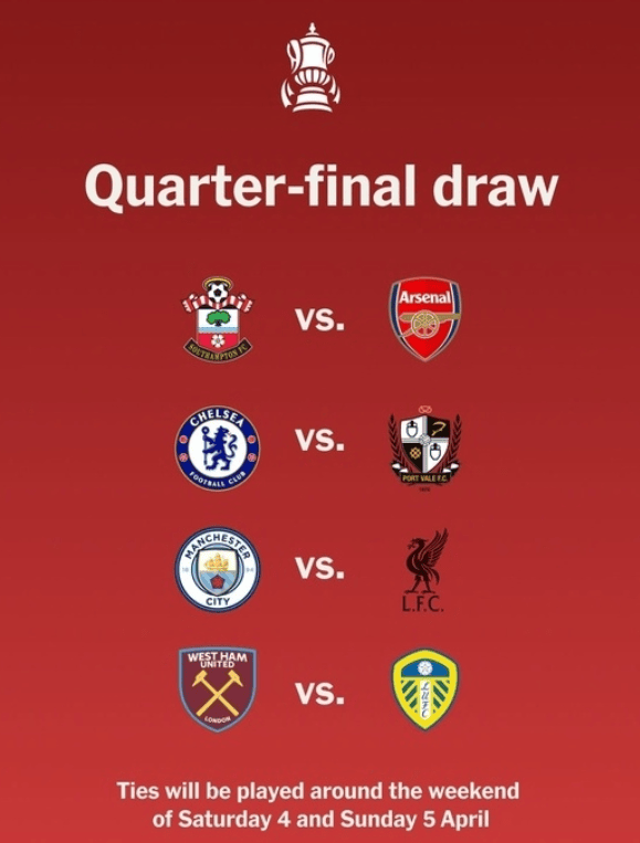 หลังจากวันแข่งขันระดับนานาชาติ ยักษ์ใหญ่หลายรายจะเข้าสู่รอบรองชนะเลิศเอฟเอ คัพ แมนเชสเตอร์ ซิตี้ จะเริ่มกับลิเวอร์พูลเวลา 19:30 น. ในวันที่ 4 เมษายน ในวันที่ 5 เมษายน จะมีสามเกมระหว่างเชลซีและพอร์ตเวอร์, เซาแธมป์ตันและอาร์เซนอล และเวสต์แฮมกับลีดส์ ยูไนเต็ด เพราะในการแข่งขันทีมชาติ อาร์เซนอล นายพลหลายคนกลับมาร่วมทีมก่อนเพราะเหตุผลคือพวกเขาได้รับบาดเจ็บ ดังนั้นโค้ชจะดำเนินการหมุนเวียนมากขึ้นในแคมเปญนี้ ดังนั้นจึงจำเป็นต้องป้องกันความเป็นไปได้ที่จะเสมอ ท้ายที่สุดแล้ว สำหรับอาร์เซนอล ตำแหน่งการครองตำแหน่งสูงสุดของพรีเมียร์ลีกนั้นสำคัญกว่า และแม้แต่การเลื่อนตำแหน่งแชมเปี้ยนส์ลีกก็มีความสำคัญเช่นกัน และโค้ชจำเป็นต้องเลือก
