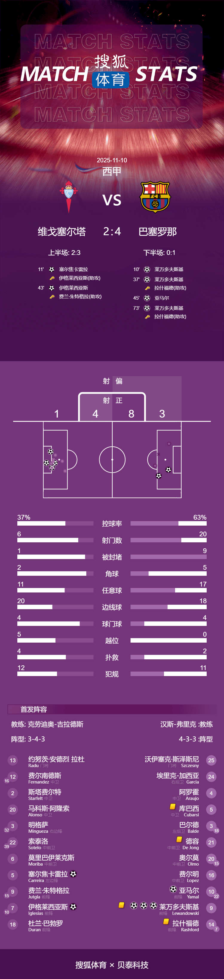 เวลา 4:00 น. ตามเวลาปักกิ่ง วันที่ 10 พฤศจิกายน บาร์เซโลนาพบกับเซลต้า บีโก้ ในนัดที่ 12 ของลาลีกา เลวานดอฟสกี้เปิดสกอร์จากจุดโทษในนาทีที่ 10 แต่คารเรร่าก็ตีเสมออย่างรวดเร็วจากการโต้กลับในนาทีถัดมา ราชฟอร์ดช่วยเลวานดอฟสกี้ทำประตูในระยะใกล้ในนาทีที่ 37 แต่อิเกลเซียสตีเสมอด้วยการยิงไกลในนาทีที่ 43 ยามาลทำประตูในระยะใกล้ในช่วงทดเวลาบาดเจ็บครึ่งแรกในนาทีที่ 72, ลูกเตะมุมของแรชฟอร์ดช่วยให้เลวานดอฟสกี้ทำแฮตทริกได้. ในช่วงทดเวลาครึ่งหลัง, เดอ ยองถูกไล่ออกจากสนามหลังจากได้รับใบเหลืองที่สอง. บาร์เซโลนาสามารถเอาชนะเซลต้าได้ 4-2 ในเกมเยือน. ด้วยผลเสมอของเรอัล มาดริดในรอบเดียวกัน, บาร์เซโลนาตามหลังเพียง 3 คะแนนเท่านั้น โดยมี 28 คะแนนจาก 12 นัด.