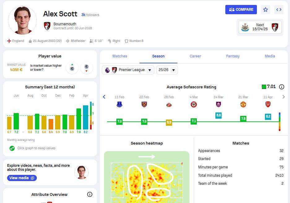 สกอตต์ไม่ใช่ผลผลิตของการฝึกเยาวชนของบอร์นมัธ ในฤดูร้อนปี 2023 เขาย้ายจากบริสตอล ซิตี้ แห่งบริสตอล เพื่อเข้าร่วมการแข่งขันชิงแชมป์อังกฤษด้วยเงิน 23 ล้านยูโร ในเวลานั้น "เชอร์รี่ เลเจียน" เพิ่งจะจบพรีเมียร์ลีกและจำเป็นเร่งด่วนเพื่อเสริมพลังของกองกลาง หลังจากเข้าร่วมแล้ว เขาได้ค่อยๆ สร้างเสถียรภาพให้กับกองกำลังหลักจากผู้เล่นหมุนเวียนเมื่อต้นฤดูกาล ฤดูกาลนี้มีความตื่นตาตื่นใจเป็นพิเศษ: 32 เกมในพรีเมียร์ลีกเข้าร่วมอย่างเต็มที่ (29 นัดและ 3 ตัวสำรอง) และเขาใช้เวลาเล่นเฉลี่ย 75 นาทีต่อเกมเพื่อยืนยันคุณลักษณะความต้านทานที่มั่นคง - นี่คือการขาดแคลนกองกลางของแมนเชสเตอร์ยูไนเต็ดในช่วงไม่กี่ปีที่ผ่านมา