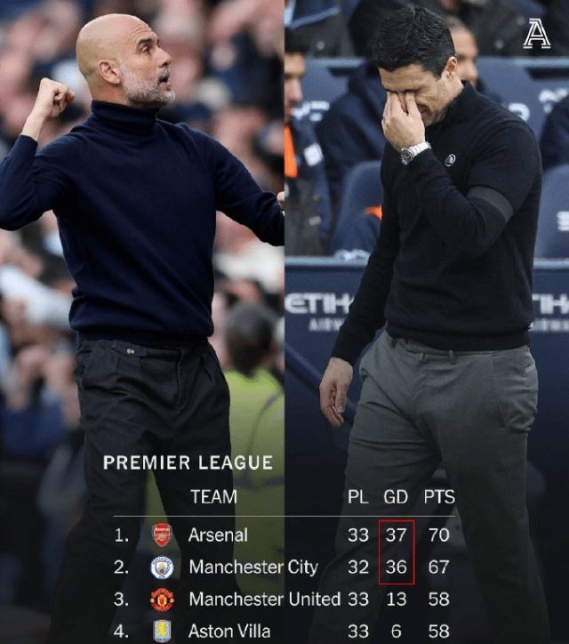 หลังจากแคมเปญนี้ แมนเชสเตอร์ ซิตี้ มี 67 แต้มในเกมเดียวน้อยกว่า 3 แต้มจากอันดับต้น ๆ ของรายการ แต่อาร์เซนอลนำ 70 แต้ม แต่แพ้สองนัดติดต่อกันในลีก และรูปแบบแชมป์พรีเมียร์ลีกก็ถูกเขียนใหม่ทั้งหมด เพราะผลต่างประตูปัจจุบันของ อาร์เซนอล อยู่ที่ 37 ประตู และ แมนฯ ซิตี้ ทำได้ 36 ประตู ดังนั้นทั้งสองทีมจะสามารถคว้าตำแหน่งสูงสุดจากคู่ต่อสู้ของพวกเขาได้
