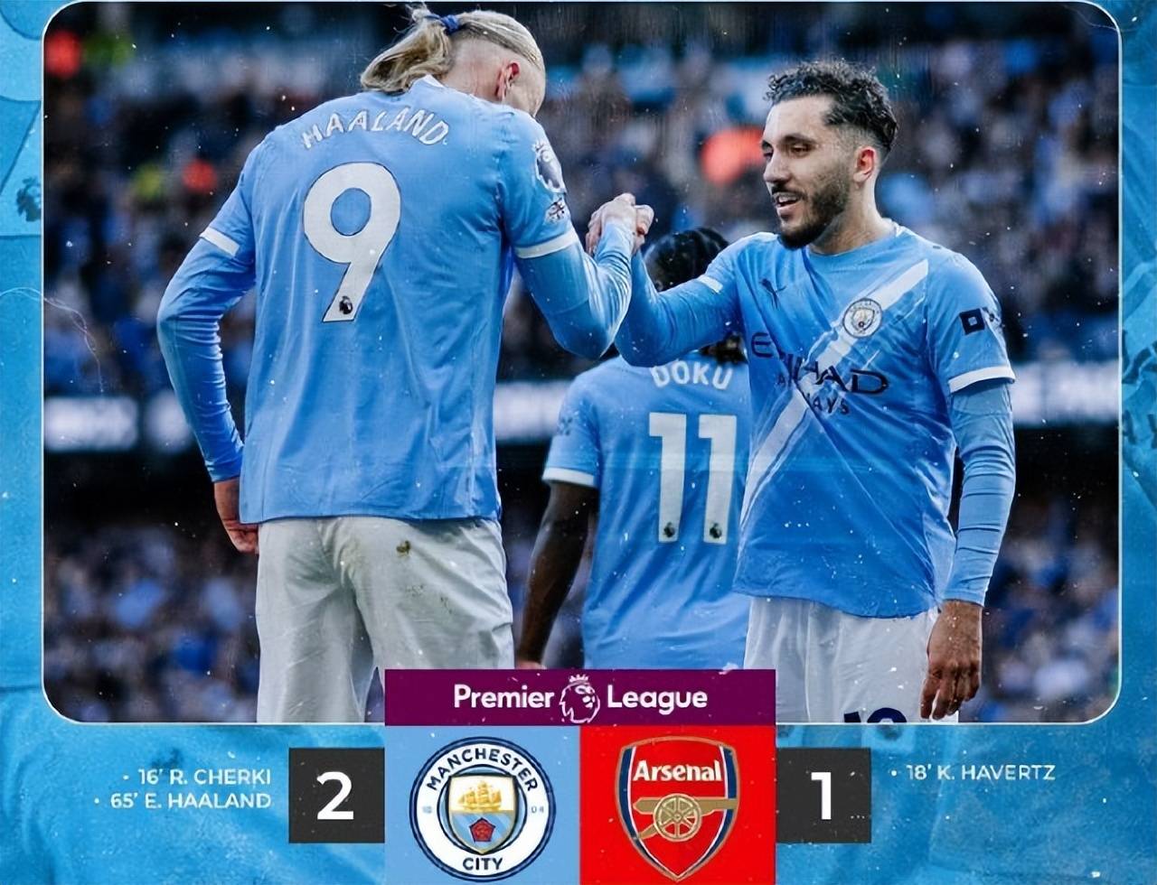 ในช่วงครึ่งหลัง ทั้งสองฝ่ายติดอยู่ในการชักเย่อ แต่อาร์เซนอลล้มเหลวในการทำคะแนนหลายครั้ง ในนาทีที่ 65 Oreili ทำประตูจากทางซ้าย Rodry ตามและเตะประตู Harland คล่องตัวเพื่อกำจัด Gabriel และยิงได้ใกล้ 2-1! นี่คือประตูลีกที่ 23 ของฮาร์แลนด์ในฤดูกาลนี้ ซึ่งพิสูจน์ให้เห็นว่าเขายังคงรักษาประสิทธิภาพของการต่อสู้ครั้งสำคัญไว้ได้ แม้เกมทั้งเกมจะไม่ได้แตะบอลก็ตามเขาสามารถคว้าโอกาสจบเกมได้เพียงนัดเดียว
