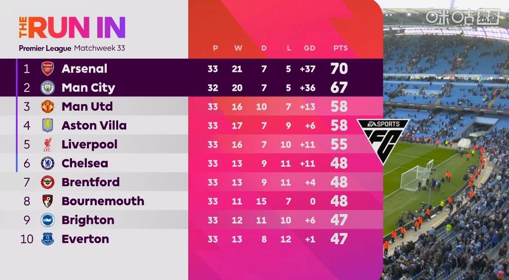 หลังจบพรีเมียร์ลีก 33 นัด แม้อาร์เซน่อลจะยังติดอันดับหนึ่งแต่ก่อน แมนฯ ซิตี้ เพียง 3 แต้ม แมนเชสเตอร์ ซิตี้ ก็ยังเหลือเกมน้อยกว่า 1 นัด และทั้งสองทีมห่างกันแค่ 1 ประตูจากผลต่างประตู ซึ่งหมายความว่าตราบใดที่ แมนเชสเตอร์ ซิตี้ ชนะ 2 ประตูขึ้นไปในเกมพรีเมียร์ลีกในช่วงกลางสัปดาห์ พวกเขาสามารถแซง อาร์เซนอล ในพรีเมียร์ลีก และได้รับโอกาสจริงเพื่อชิงแชมป์
