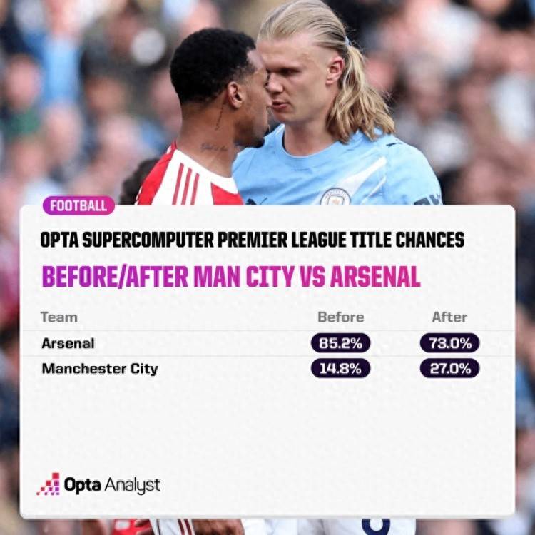 ออปต้าทำนายแชมป์พรีเมียร์ลีกในฤดูกาลนี้ โดยอาร์เซนอลสูงถึง 73% และแมนเชสเตอร์ ซิตี้ มีเพียง 27% ก่อนแคมเปญนี้ โอกาสของอาร์เซนอลในการคว้าแชมป์สูงถึง 85 2% และแมนเชสเตอร์ซิตี้มีเพียง 14. 8%