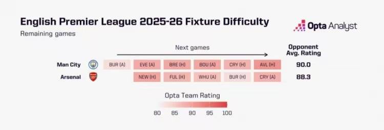 สาเหตุที่ออปตาต้องพูดถึงความยากในการคว้าแชมป์ในตารางพรีเมียร์ลีกที่เหลือของพรีเมียร์ลีกในฤดูกาลนี้ ออปต้าเชื่อว่าความแข็งแกร่งของคู่ต่อสู้ที่เหลืออยู่ของแมนเชสเตอร์ ซิตี้ นั้นแข็งแกร่งกว่าของอาร์เซนอล