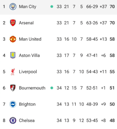 ทั้งสองฝ่ายล้มเหลวในการเขียนคะแนนใหม่ในครึ่งหลัง และในที่สุดแมนเชสเตอร์ซิตี้ก็รักษาความได้เปรียบหนึ่งประตูจนจบ หลังการสู้รบครั้งนี้ แมนเชสเตอร์ ซิตี้ และ อาร์เซนอล มี 70 แต้มเท่ากัน และทั้งสองทีมลงเล่น 33 เกม โดยทำประตูได้ต่างกัน 37 เกม แมนเชสเตอร์ ซิตี้ ยิงได้ 66 แต้ม และอาร์เซนอล 63 ดังนั้น แมนเชสเตอร์ ซิตี้ ทำประตูได้มากกว่าด้วยประตูที่มากกว่า ควรสังเกตว่ารอบนี้ของอาร์เซนอลยังไม่ได้เล่น และพวกเขาจะเล่นเวลา 3:00 น. ของวันที่ 26 เมษายน ตามเวลาปักกิ่ง เวลา 3:00 น. เวลา 3:00 น. ตามเวลาปักกิ่ง เวลา 3:00 น. ตามเวลาปักกิ่ง แม้ว่าแมนเชสเตอร์ ซิตี้ จะเป็นเกมแรกในรอบนี้ แต่เนื่องจากก่อนหน้านี้มีเกมน้อยกว่าหนึ่งเกม จำนวนเกมระหว่างสองฝ่ายที่แท้จริงจึงเท่ากันชั่วคราว วันที่แต่งหน้าของ แมนฯ ซิตี้ ให้กับ คริสตัล พาเลซ ยังไม่ได้รับการกำหนด