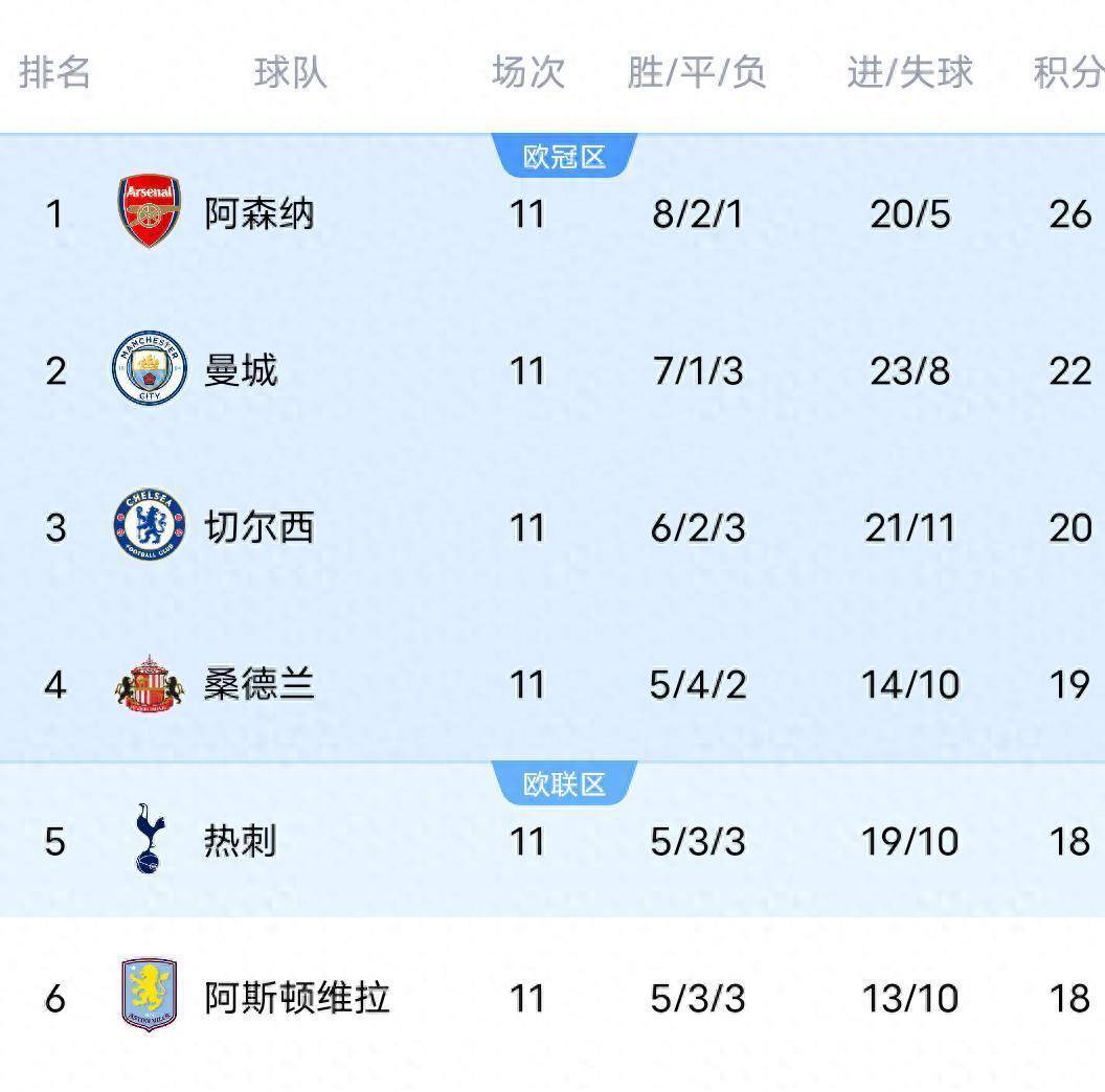 ตารางลีกแสดงให้เห็นถึงโครงสร้างแบบลำดับชั้นที่ชัดเจน อาร์เซนอลครองตำแหน่งจ่าฝูงอย่างสบายๆ ด้วย 26 คะแนนจากชัยชนะ 8 นัด เสมอ 2 นัด และแพ้ 1 นัด ตามมาติดๆ ด้วยแมนเชสเตอร์ ซิตี้ที่มี 22 คะแนนหลังจากชัยชนะล่าสุดของพวกเขา เชลซีอยู่ในอันดับที่สามด้วย 20 คะแนน ความประหลาดใจที่ใหญ่ที่สุดมาจากซันเดอร์แลนด์ ทีมที่เพิ่งเลื่อนชั้นขึ้นมาใหม่ซึ่งอยู่ในอันดับที่สี่ด้วย 19 คะแนนจากชัยชนะ 5 นัด เสมอ 4 นัด และแพ้ 2 นัด กลายเป็นม้ามืดของฤดูกาลนี้ ท็อตแน่ม ฮ็อตสเปอร์, แอสตัน วิลล่า, แมนเชสเตอร์ ยูไนเต็ด, ลิเวอร์พูล และบอร์นมัธ ต่างมีคะแนนเท่ากันที่ 18 คะแนน กลายเป็นกลุ่มใหญ่ในตารางกลางที่การต่อสู้เพื่อชิงตั๋วไปเล่นในแชมเปียนส์ลีกนั้นดุเดือดมาก ในโซนตกชั้น วูล์ฟแฮมป์ตัน วันเดอเรอร์ส อยู่ในอันดับสุดท้ายด้วยคะแนนเพียง 2 คะแนน ขณะที่น็อตติงแฮม ฟอเรสต์ ชนะในนัดล่าสุดทำให้พวกเขามีคะแนนรวมเป็น 9 คะแนน ยังคงมีความหวังในการรอดตกชั้นร่วมกับลีดส์ ยูไนเต็ด, เบิร์นลีย์ และทีมอื่น ๆ