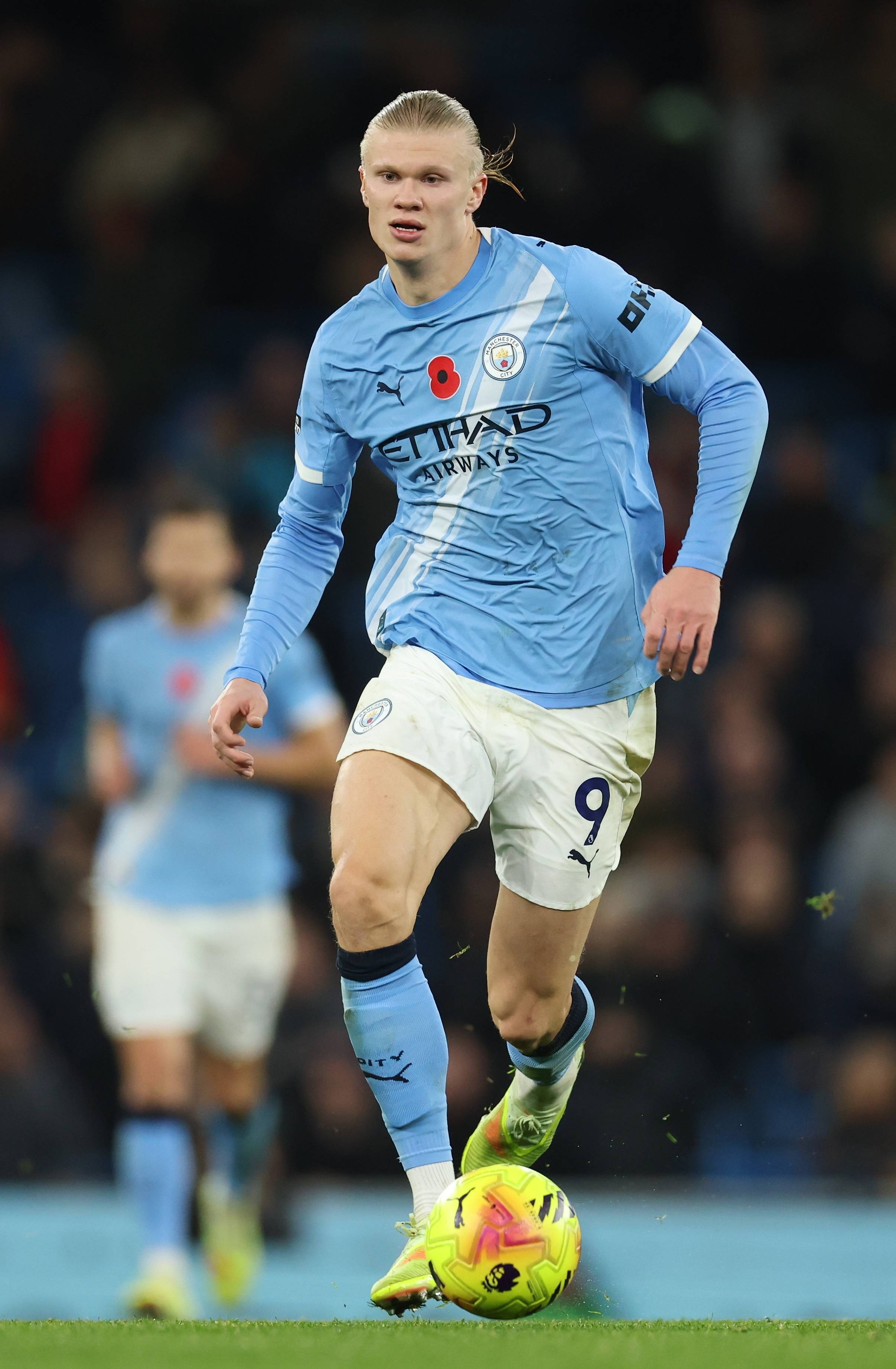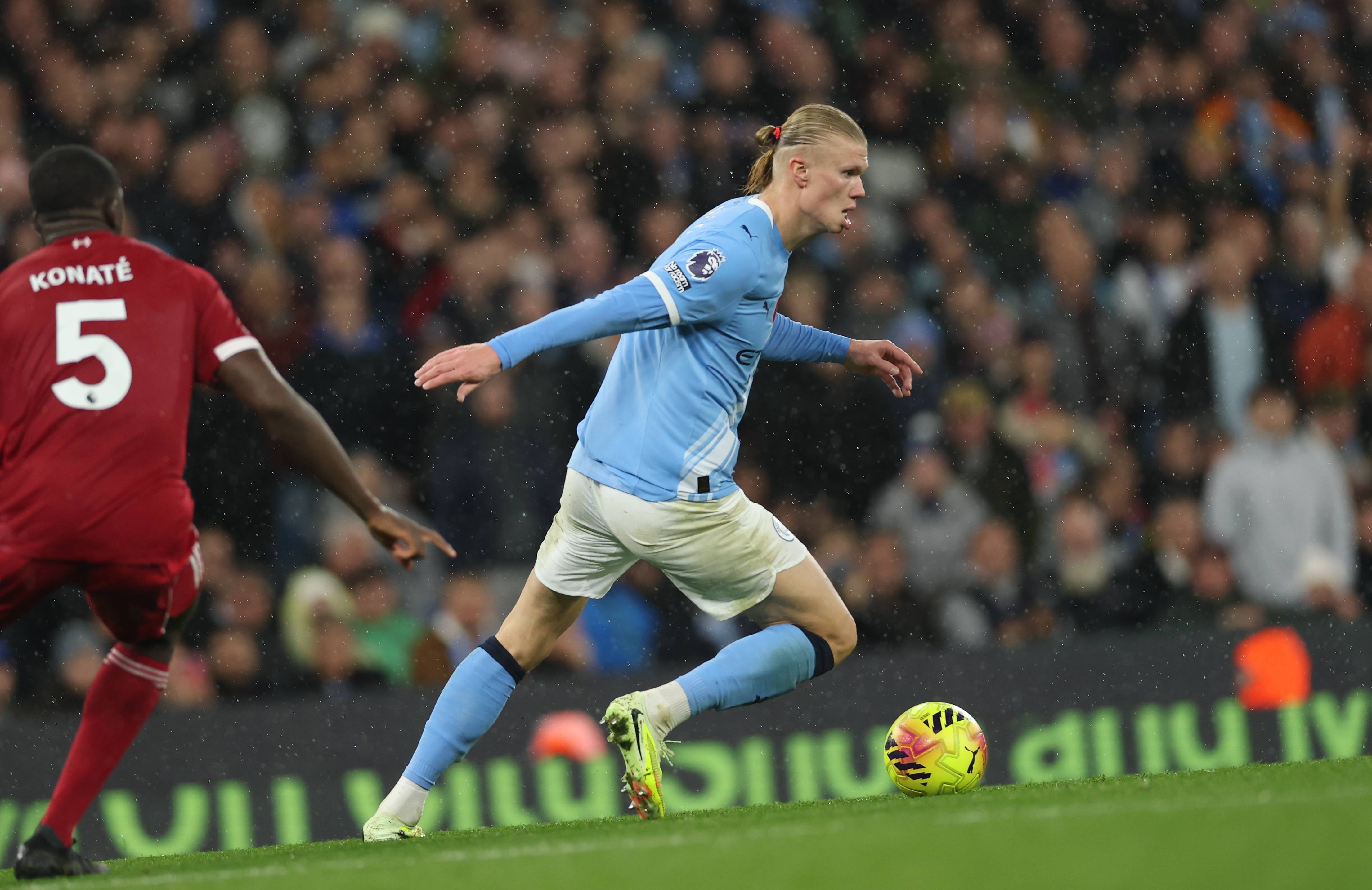เมื่อวันที่ 9 พฤศจิกายน, นักเตะแมนเชสเตอร์ ซิตี เออร์ลิง ฮาลันด์ (กลาง) ระหว่างการแข่งขัน. ซีเอ็นเอช/อีพีเอ