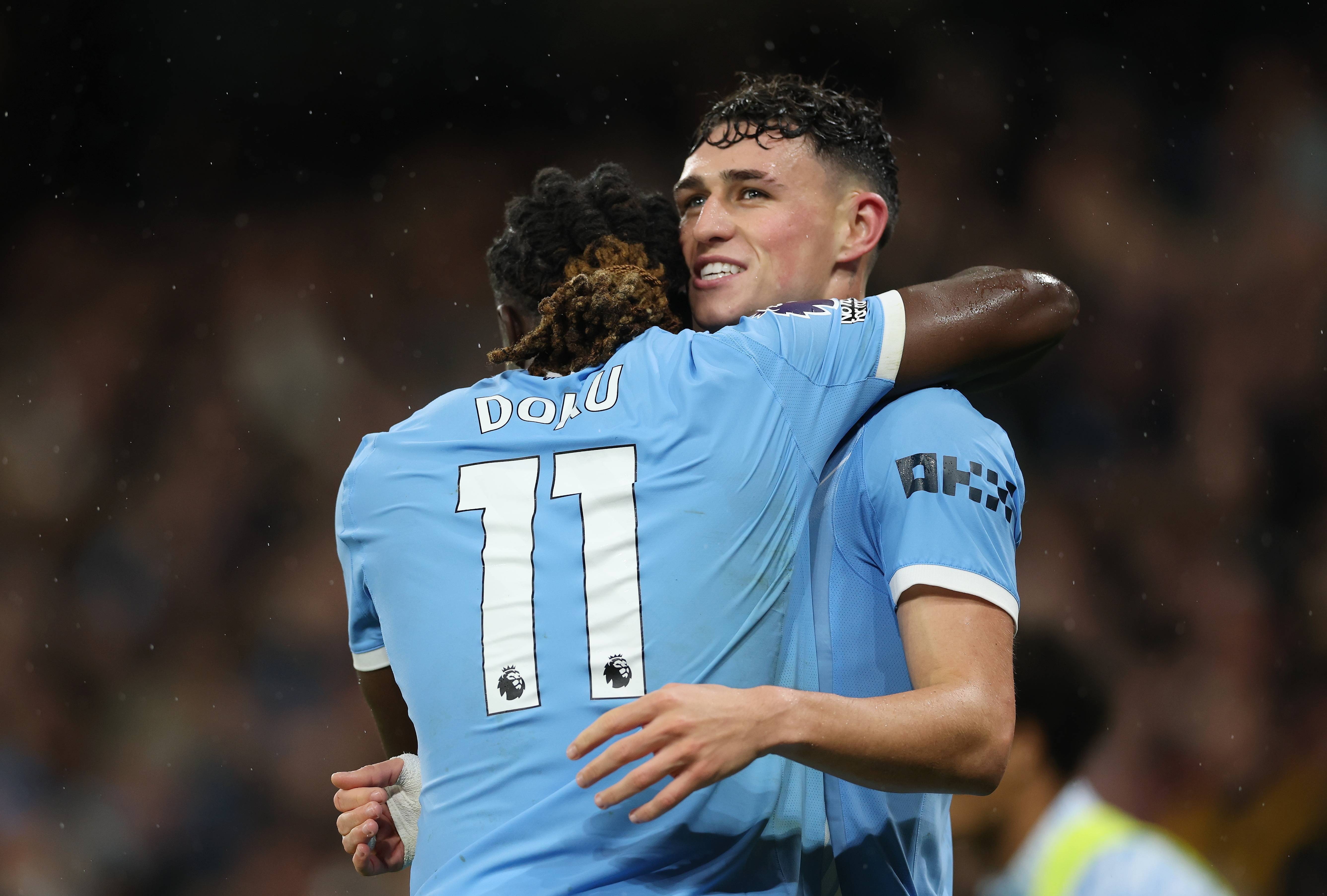 เมื่อวันที่ 9 พฤศจิกายน นักเตะแมนเชสเตอร์ ซิตี้ ดูคู (ซ้าย) ฉลองกับเพื่อนร่วมทีม โฟเดน หลังจากทำประตูที่สามให้กับทีมของเขา สำนักข่าวซินหัว/EPA