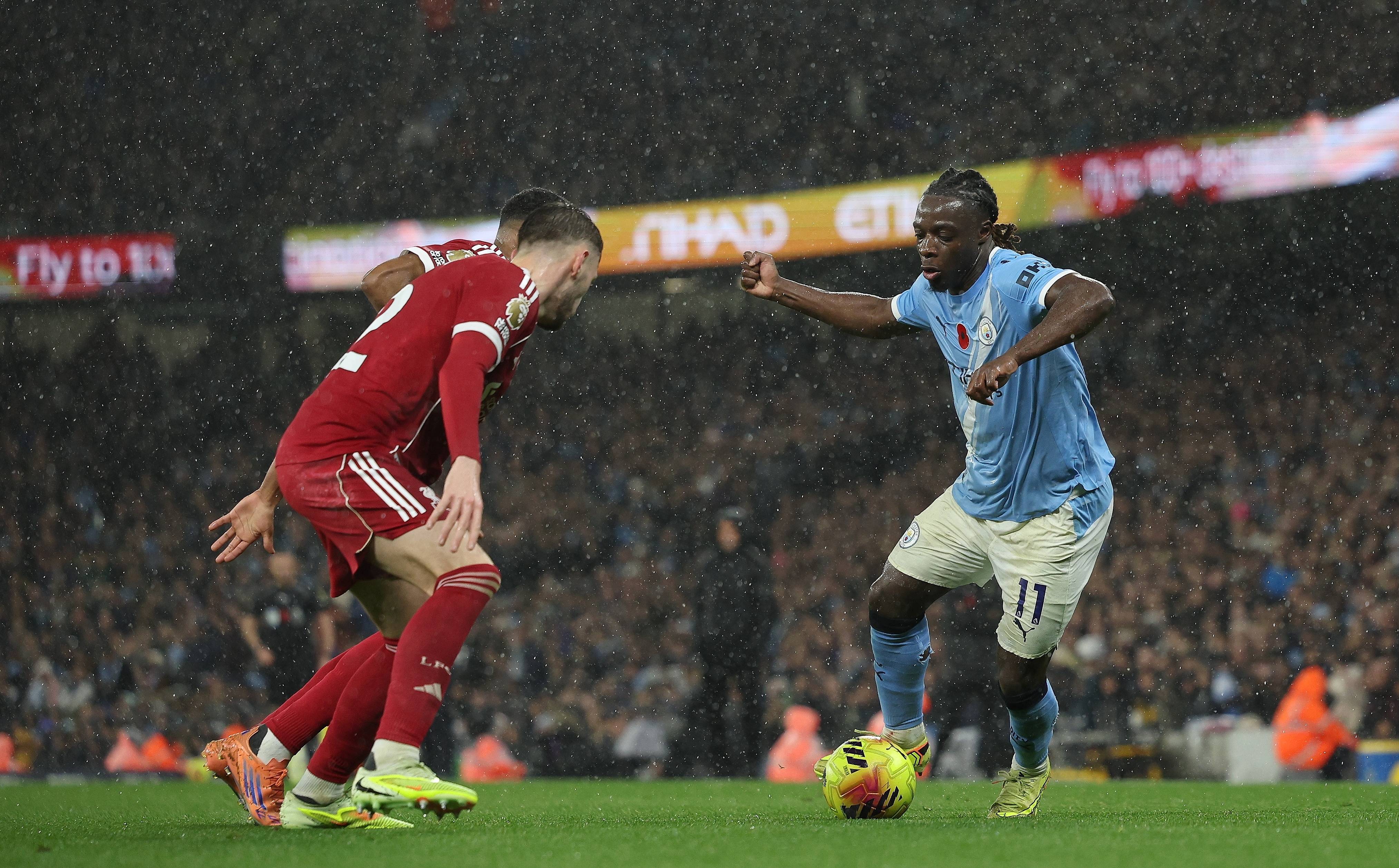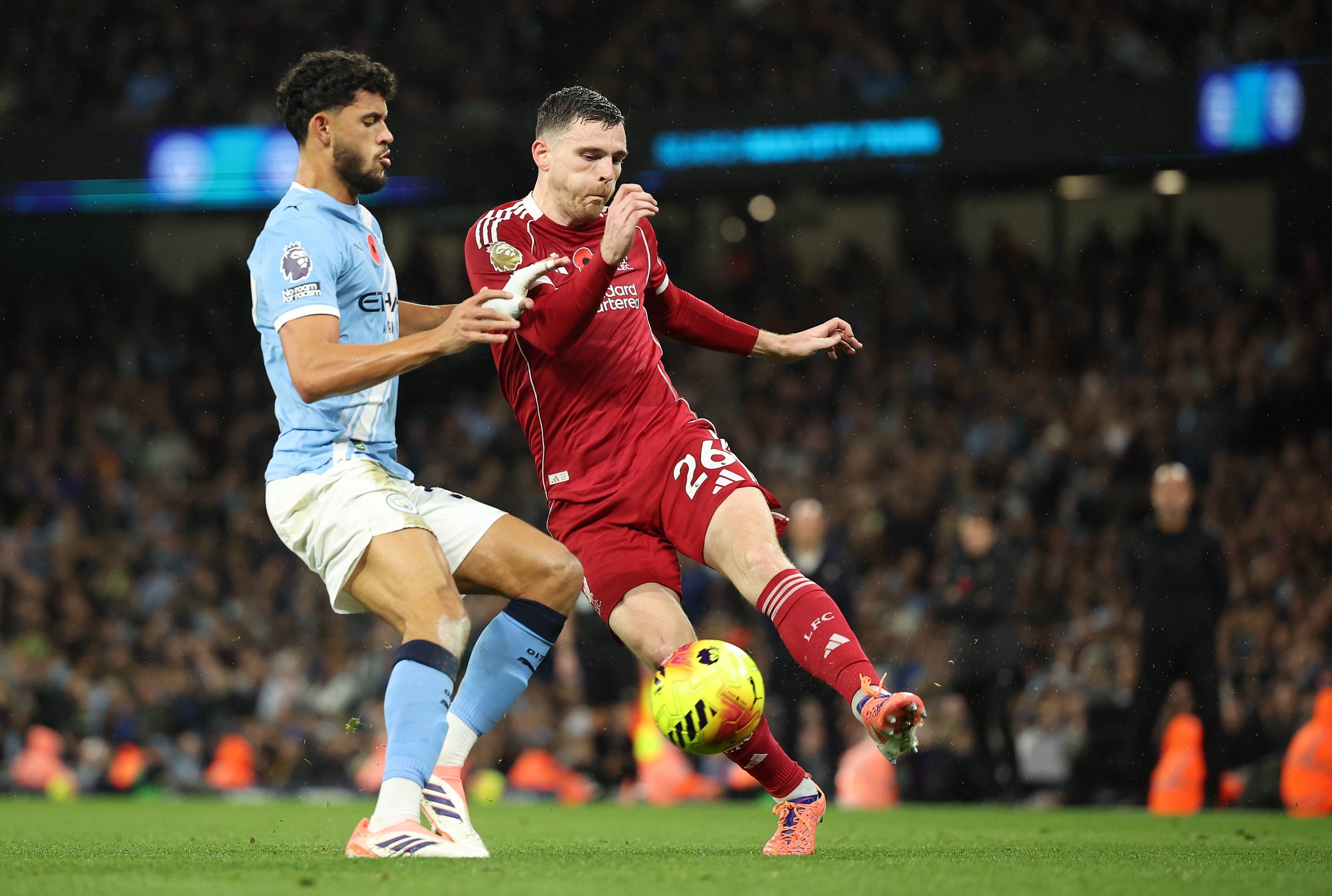 เมื่อวันที่ 9 พฤศจิกายน นูเนสของแมนเชสเตอร์ ซิตี้ (ซ้าย) เข้าปะทะกับโรเบิร์ตสันของลิเวอร์พูลเพื่อแย่งบอล ซีเอ็นเอ/อีพีเอ