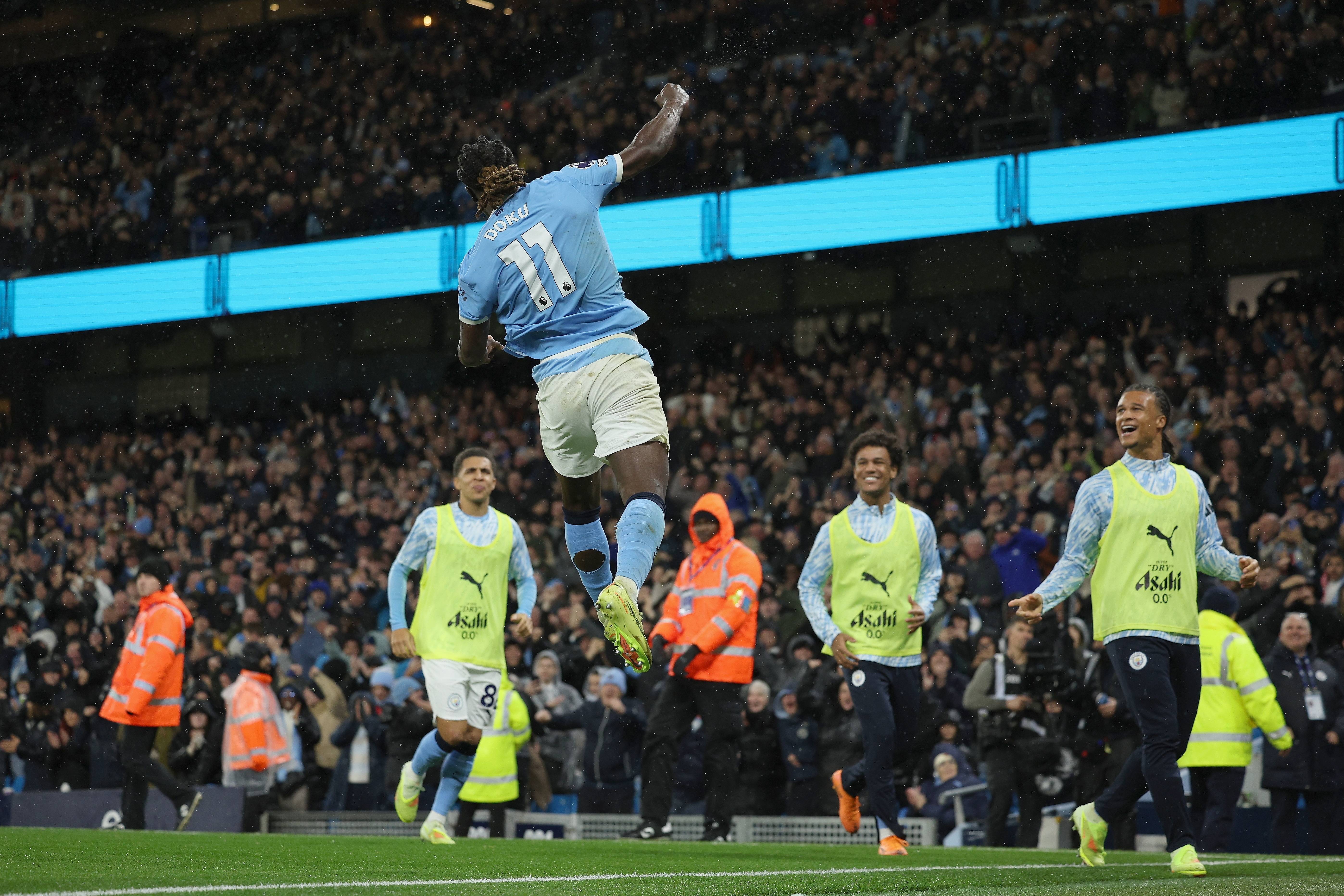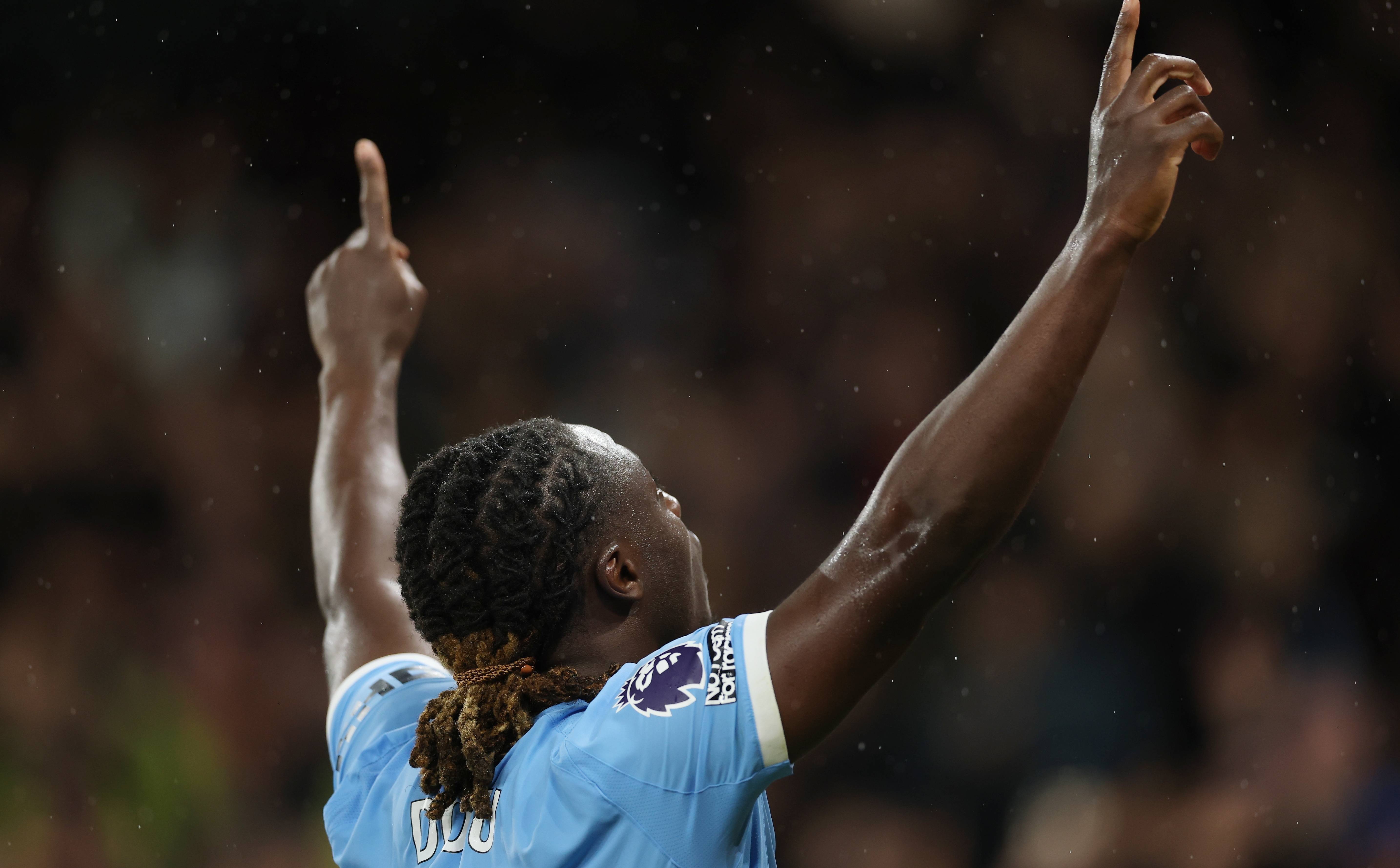 เมื่อวันที่ 9 พฤศจิกายน นักเตะแมนเชสเตอร์ ซิตี้ ดูคู (ซ้าย) ฉลองการทำประตูที่สามของทีม Xinhua/EPA
