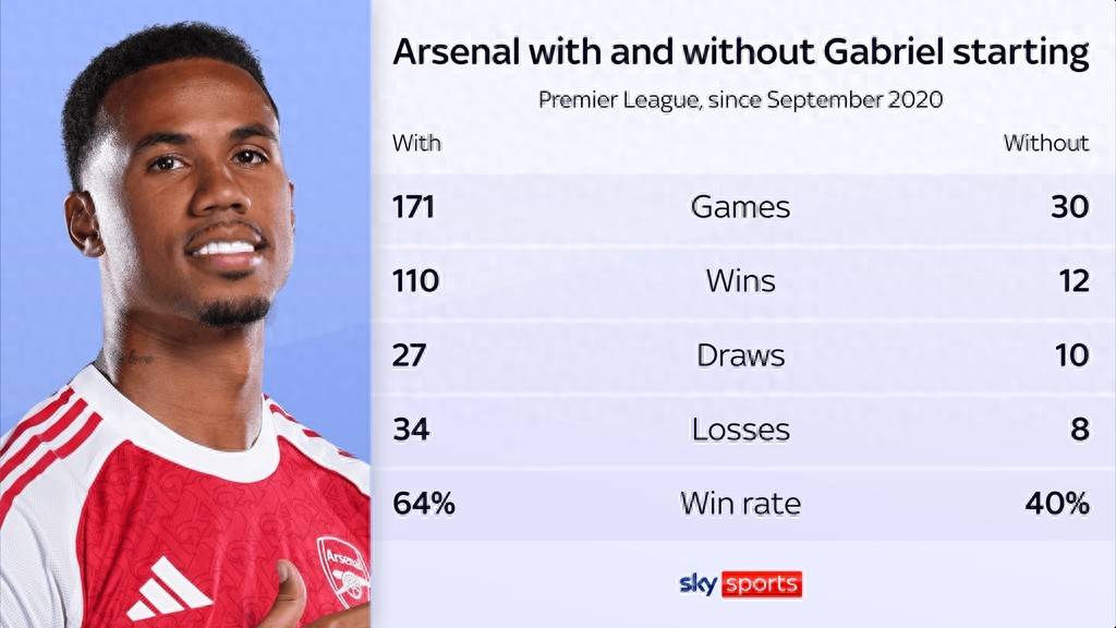 ตามสถิติของ Sky Sports อาร์เซนอลเป็นทีมที่แตกต่างอย่างสิ้นเชิงเมื่อมีกาเบรียลอยู่ในทีมเมื่อเทียบกับตอนที่เขาไม่อยู่ ตั้งแต่เดือนกันยายน 2020 เป็นต้นมา สโมสรได้คว้าชัยชนะ 110 นัดจาก 171 นัดที่กาเบรียลลงเล่นให้กับอาร์เซนอล คิดเป็นอัตราการชนะ 64%ในทางตรงกันข้าม ในระหว่างการแข่งขัน 30 นัดที่เขาพลาดไป อาร์เซนอลสามารถเก็บชัยชนะได้เพียง 12 นัดเท่านั้น ทำให้อัตราการชนะลดลงเหลือ 40% ซึ่งแปลว่าเมื่อกาเบรียลไม่อยู่ในสนาม อัตราการชนะของทีมลดลงถึง 24% เมื่อเทียบกับตอนที่เขาลงเล่น
