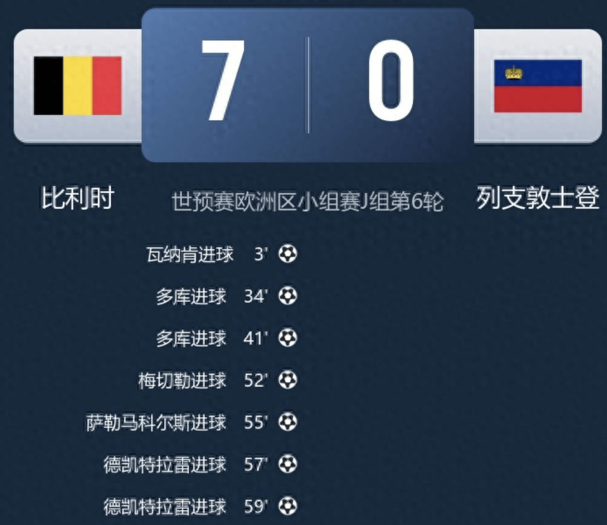 เมื่อวันที่ 19 พฤศจิกายน เบลเยียมเป็นเจ้าภาพรับการมาเยือนของลิกเตนสไตน์ในการแข่งขันฟุตบอลโลกรอบคัดเลือกของยูฟ่า เพียงสามนาทีหลังเริ่มเกม วานาเกนโหม่งทำประตูให้เบลเยียมขึ้นนำ จากนั้นดูคูก็ยิงสองประตูติดต่อกันในนาทีที่ 35 และ 43 ทำให้เบลเยียมนำห่าง 3-0 ในครึ่งแรกเบลเยียมยังคงโชว์ฟอร์มการทำประตูอย่างต่อเนื่อง โดยระหว่างนาทีที่ 53 ถึง 59 ของครึ่งหลัง พวกเขาทำประตูเพิ่มอีกสี่ลูก โดยเดอ เคเตลาเออร์ยิงสองประตูติดต่อกันอย่างรวดเร็ว ในที่สุด เบลเยียมเอาชนะลิกเตนสไตน์ไปอย่างขาดลอย 7-0 ที่บ้านของตัวเอง คว้าอันดับหนึ่งในกลุ่ม และผ่านเข้ารอบสุดท้ายของฟุตบอลโลกชัยชนะของเบลเยียมทั้งสามนัดที่แบ่งปันในช่วงบ่ายของวันที่ 18 พฤศจิกายนนั้นถูกต้อง โดยโคโซโวทำได้สองประตูและสกอร์ 1-1 ก็ถูกต้องเช่นกัน การทำนายผลฟุตบอลเมื่อวานนี้มีการทายผลถูกต้อง 4 จาก 5 แมตช์ ในครึ่งแรก วาเนเก้นเป็นผู้เปิดสกอร์แรก ตามด้วยสองประตูของโดกุหลังจากพักครึ่ง เมเชเล่และซาเลมาเกอร์สทำประตูได้ โดยเดอ เคอเตลาเร่ทำประตูที่สองของเขาให้เบลเยียมเอาชนะลิกเตนสไตน์ไป 7-0 ในตารางคะแนน เบลเยียมคว้าตำแหน่งจ่าฝูงของกลุ่มและผ่านเข้ารอบโดยตรง ขณะที่ลิกเตนสไตน์จบอันดับสุดท้ายโดยไม่มีคะแนน
