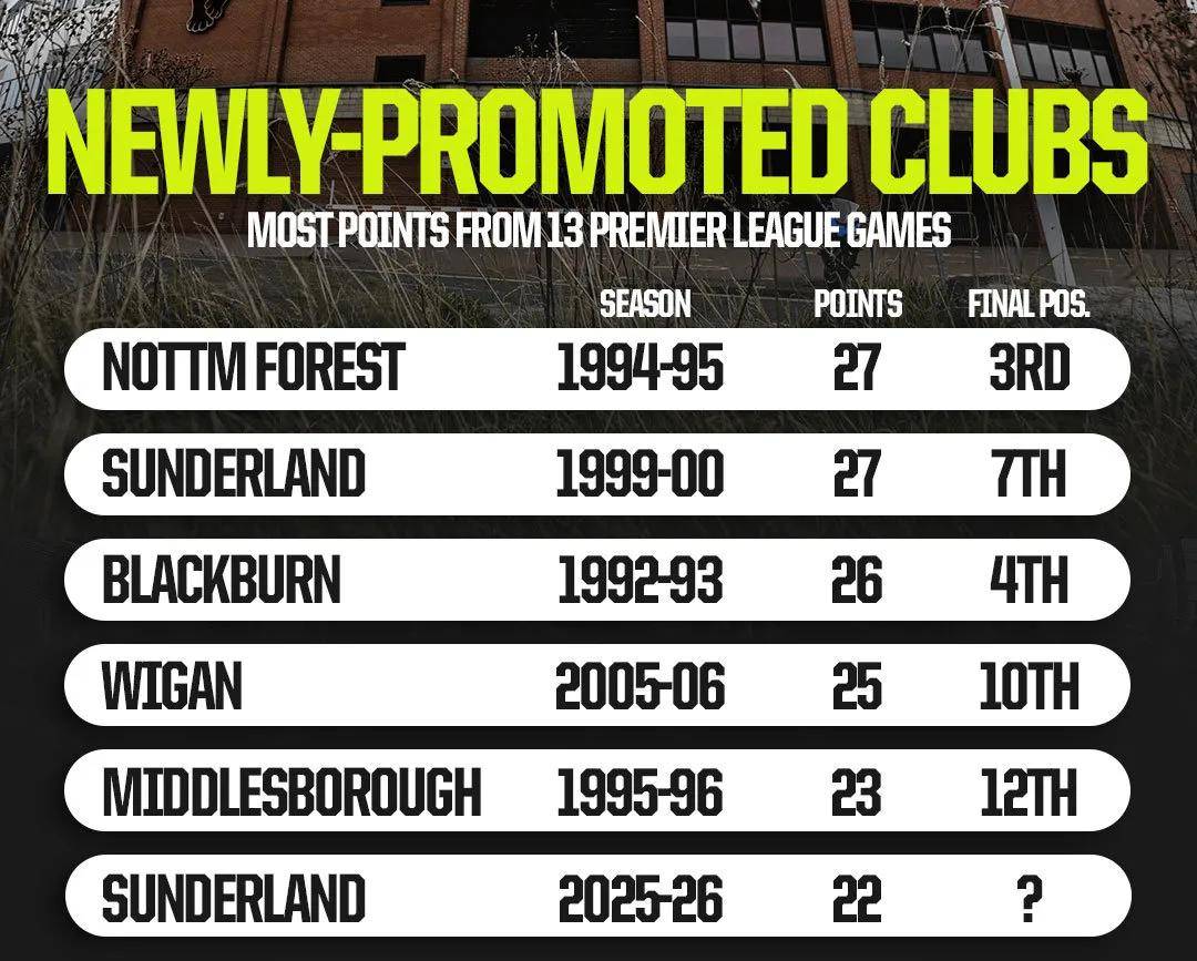 สถิติเปิดเผยว่า ซันเดอร์แลนด์ เป็นทีมที่ประสบความสำเร็จมากที่สุดในพรีเมียร์ลีกในรอบสองทศวรรษที่ผ่านมา ทีมที่เพิ่งเลื่อนชั้นขึ้นมาและประสบความสำเร็จอย่างน่าทึ่งครั้งล่าสุดคือ วิแกน แอธเลติก ในฤดูกาล 2005-06