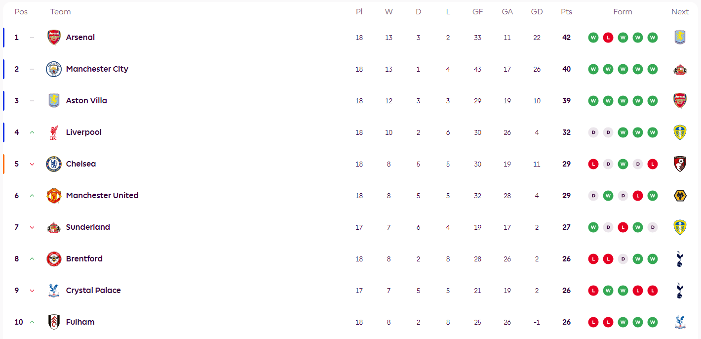แมนเชสเตอร์ ยูไนเต็ด ซึ่งได้ลงเล่นไปก่อนแล้ว เอาชนะนิวคาสเซิล ยูไนเต็ด 1-0 และขณะนี้รั้งอันดับหก มีคะแนนเท่ากับเชลซี แต่ตามหลังด้วยผลต่างประตูได้เสีย 4-11 ที่น่าสังเกตคือ ซันเดอร์แลนด์ ซึ่งยังไม่ได้ลงเล่นในรอบนี้ ปัจจุบันตามหลังทั้งสองทีมอยู่สองคะแนน และหากชนะก็จะขยับขึ้นอันดับห้า
