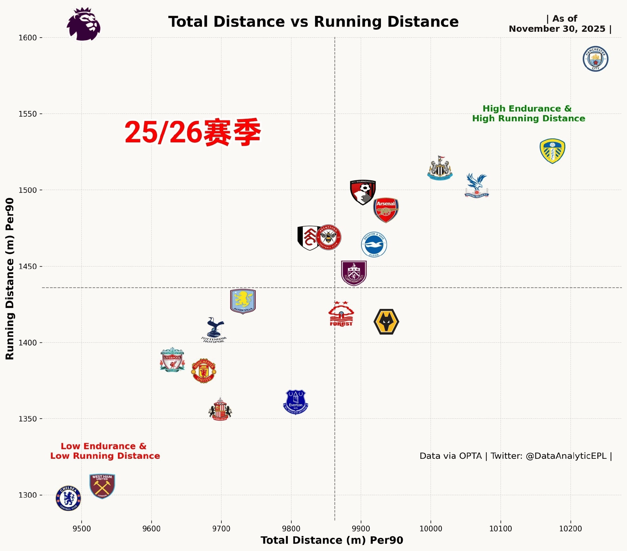 ในแง่ของคุณภาพการวิ่งที่แสดงออกมาโดยทีมในพรีเมียร์ลีกฤดูกาลนี้ เชลซีอยู่ในอันดับสุดท้ายทั้งในระยะทางรวมที่วิ่งและระยะทางที่วิ่งในสปีดสูง ซึ่งสอดคล้องกับจำนวนใบแดงที่ทีมได้รับบ่อยครั้ง นั่นหมายความว่าพวกเขาเล่นในสัดส่วนที่สำคัญของแมตช์ด้วยผู้เล่นเพียงสิบคน ส่งผลให้ตัวเลขการวิ่งเฉลี่ยของพวกเขาดูต่ำกว่า (เนื่องจากข้อมูลรวมสะท้อนถึงการเล่นด้วยผู้เล่นสิบคน แต่ค่าเฉลี่ยยังคงคำนวณจากผู้เล่นสิบเอ็ดคน)