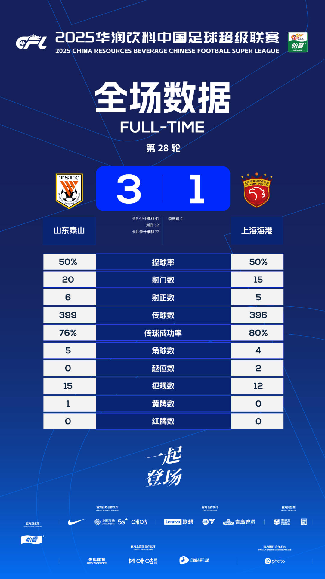 เวลา 15:30 น. ของวันที่ 26 ตุลาคม ในแมตช์เดย์ที่สามของรอบที่ 28 ศึกไชน่า เรซอร์ส เบเวอเรจ ไชนีส ซูเปอร์ลีก 2025 ทีมซานตง ไท่ซาน พบกับ เซี่ยงไฮ้ พอร์ต ที่สนามกีฬานานาชาติโอลิมปิกจี่หนาน ประตูจาก หลี่ ซินเซียง ทำให้เซี่ยงไฮ้ พอร์ต ขึ้นนำก่อน แต่คาซาอิชวิลีของซานตง ไท่ซาน ยิงสองประตู และหลิว หยางยิงเพิ่มอีกหนึ่งประตู สุดท้ายซานตง ไท่ซาน เอาชนะเซี่ยงไฮ้ พอร์ต ไปได้ 3-1