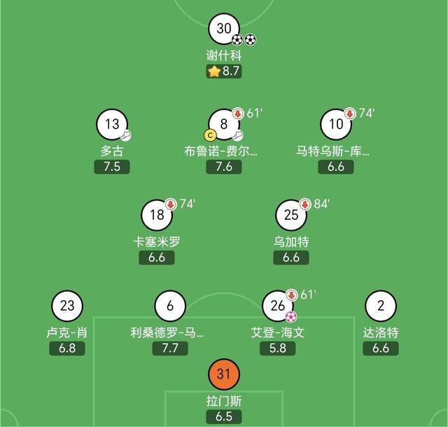 เซสโก นำทีมเป็นกองหน้า โดยมี ดูกู, บี. เฟอร์นันเดส และ คูนา อยู่เบื้องหลัง ขณะที่ คาเซมิโร และ อูการ์เต้ ทำหน้าที่เป็นคู่กลางในแดนกลาง