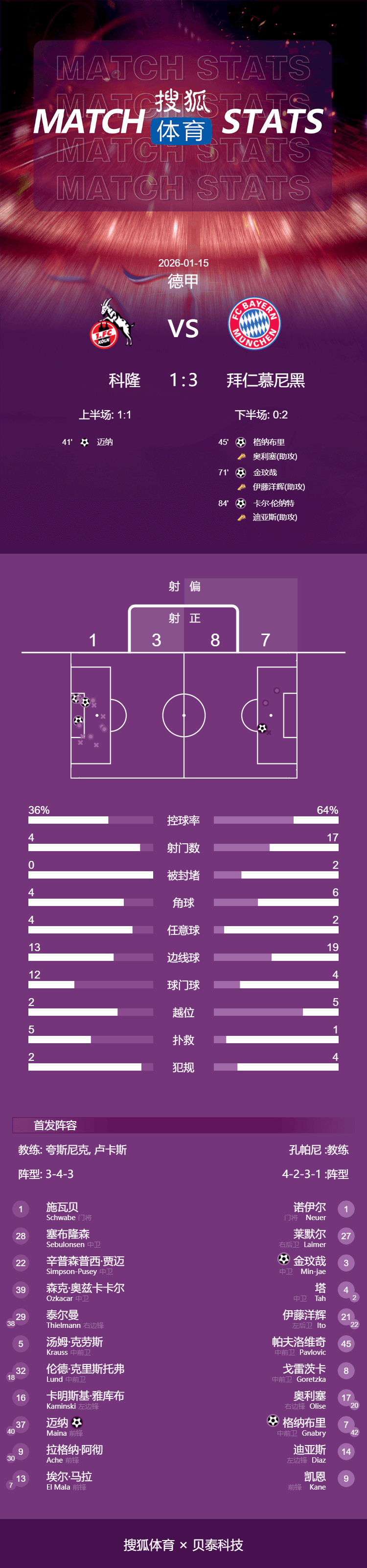 เวลา 03:30 น. ตามเวลาปักกิ่ง วันที่ 15 มกราคม 2026 โคโลญจน์เปิดบ้านต้อนรับบาเยิร์น มิวนิค ในการแข่งขันบุนเดสลีกา รอบที่ 17 ในครึ่งแรก เมนเนอร์ทำประตูแรกให้กับโคโลญจน์ ก่อนที่กนาบรีจะตีเสมอให้กับบาเยิร์นในครึ่งหลัง คิม มิน-แจ โหม่งทำประตูให้บาเยิร์นขึ้นนำ ก่อนที่คาร์ล-ไฮนซ์ รอนเนิร์ต จะปิดท้ายชัยชนะ บาเยิร์น มิวนิค คว้าชัยชนะ 3-1 เหนือโคโลญจน์ในที่สุด ปัจจุบันบาเยิร์นนำเป็นจ่าฝูงของตารางลีก โดยยังไม่แพ้ใครหลังจากลงเล่น 17 นัด ชนะ 15 นัด และเสมอ 2 นัด มีคะแนนนำโบรุสเซีย ดอร์ทมุนด์ 11 คะแนน