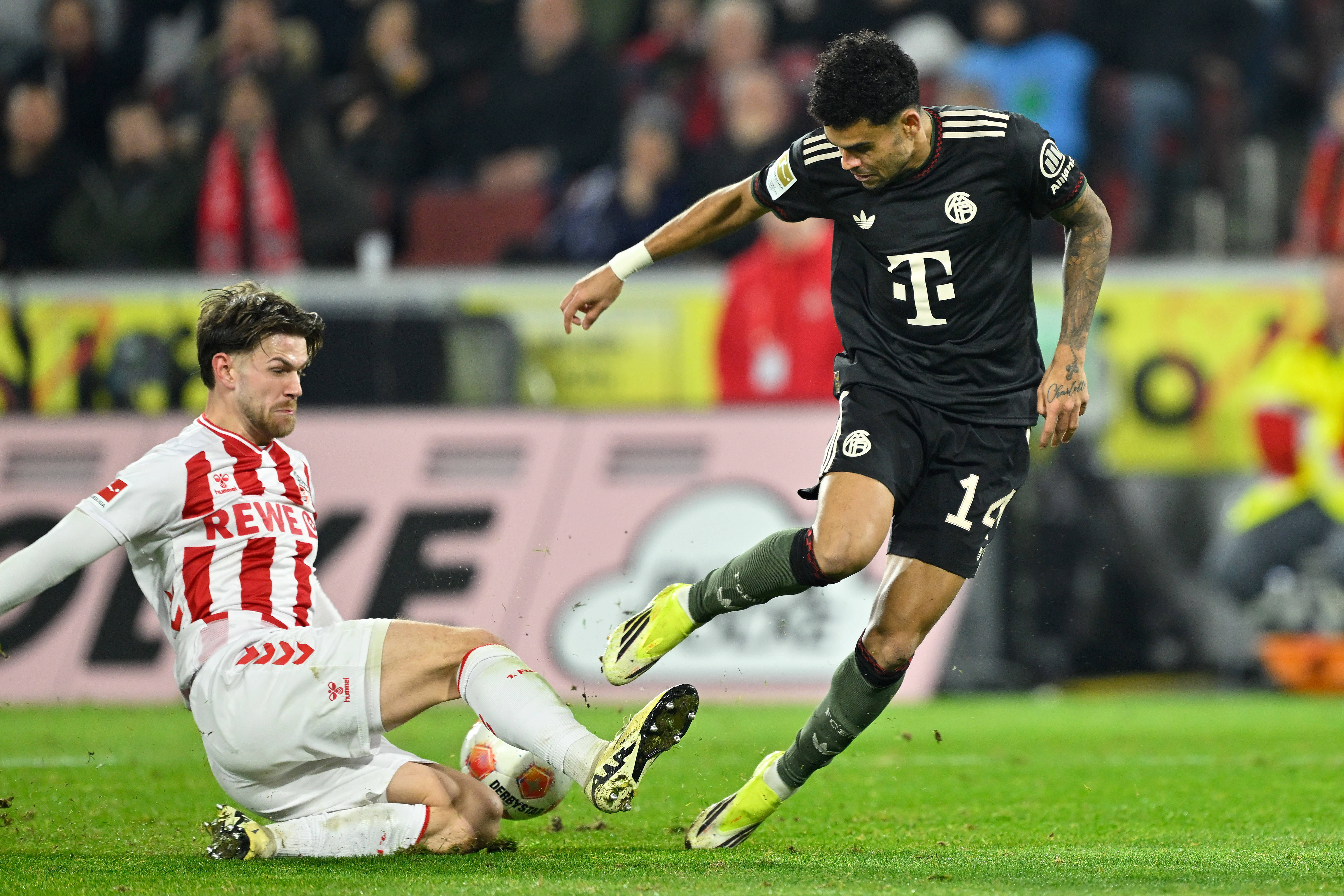 เมื่อวันที่ 14 มกราคม ดิอาซของบาเยิร์น มิวนิค (ขวา) และทิลมันน์ของโคโลญจน์ต่อสู้เพื่อแย่งบอลระหว่างการแข่งขัน สำนักข่าวซินหัว (ภาพโดย Ulrich Hufnagel)