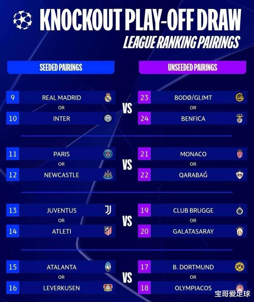 ปารีส แซงต์-แชร์กแมง ทีมอันดับที่ 11 และนิวคาสเซิล ยูไนเต็ด ทีมอันดับที่ 12 จะพบกับโมนาโก ทีมอันดับที่ 21 และคาราบัค ทีมอันดับที่ 22 ตามลำดับ โดย PSG อาจมีโอกาสพบกับโมนาโก ทีมร่วมลีกเอิง ฤดูกาลที่แล้ว พวกเขาถล่มคู่แข่งจากลีกเอิงอย่างเบรสต์ 10-0 ในสองนัดเพลย์ออฟ ก่อนจะเดินหน้าคว้าแชมป์ไปครองพวกเขาสามารถทำซ้ำปาฏิหาริย์ของฤดูกาลที่แล้วในฤดูกาลนี้ได้หรือไม่?