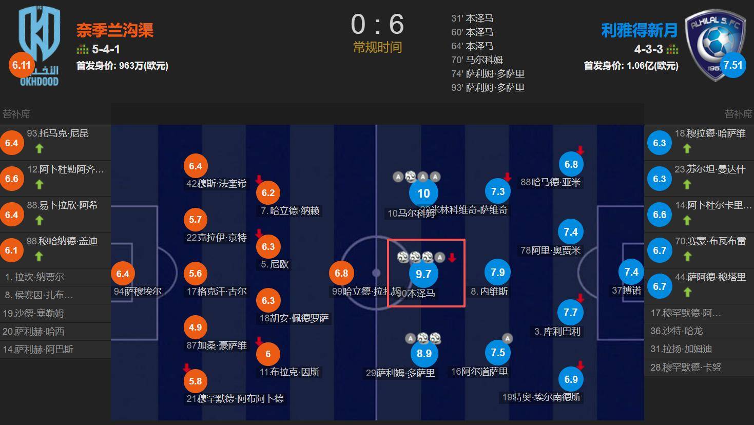 ในการแข่งขันนี้ เบนเซม่าทำประตูแรกให้กับทีมได้ถึงสามลูก โดยหนึ่งในนั้นมาจากการแอสซิสต์ของมัลคอม เบนเซม่าตอบแทนด้วยการแอสซิสต์ให้มัลคอมทำประตูได้หนึ่งลูก หลังจบการแข่งขัน เบนเซม่าซึ่งทำได้สามประตูและหนึ่งแอสซิสต์ ได้รับคะแนนสูงสุด 9.7 ขณะที่มัลคอมซึ่งทำสามแอสซิสต์และหนึ่งประตู ได้รับคะแนนเต็ม 10การมาถึงของเบนเซม่าถือเป็นการฟื้นฟูปีกของอัล-นาสเซอร์อย่างแท้จริง กองหน้าตัวกลางที่ทรงพลังมีความสามารถในการครองบอลและสร้างโอกาสได้ ซึ่งปลดล็อกศักยภาพของปีกทั้งสองคน: ปีกซ้าย S. อัล-ดอวซารี ทำได้สองประตูและหนึ่งแอสซิสต์ ในขณะที่ปีกขวา มัลคอม เพิ่มอีกสามประตูและหนึ่งแอสซิสต์ นี่คือมิติที่นูเนสขาดไปอย่างแท้จริง ในวัย 38 ปี เบนเซม่ายังคงเหนือกว่านูเนสวัย 26 ปีอยู่มาก