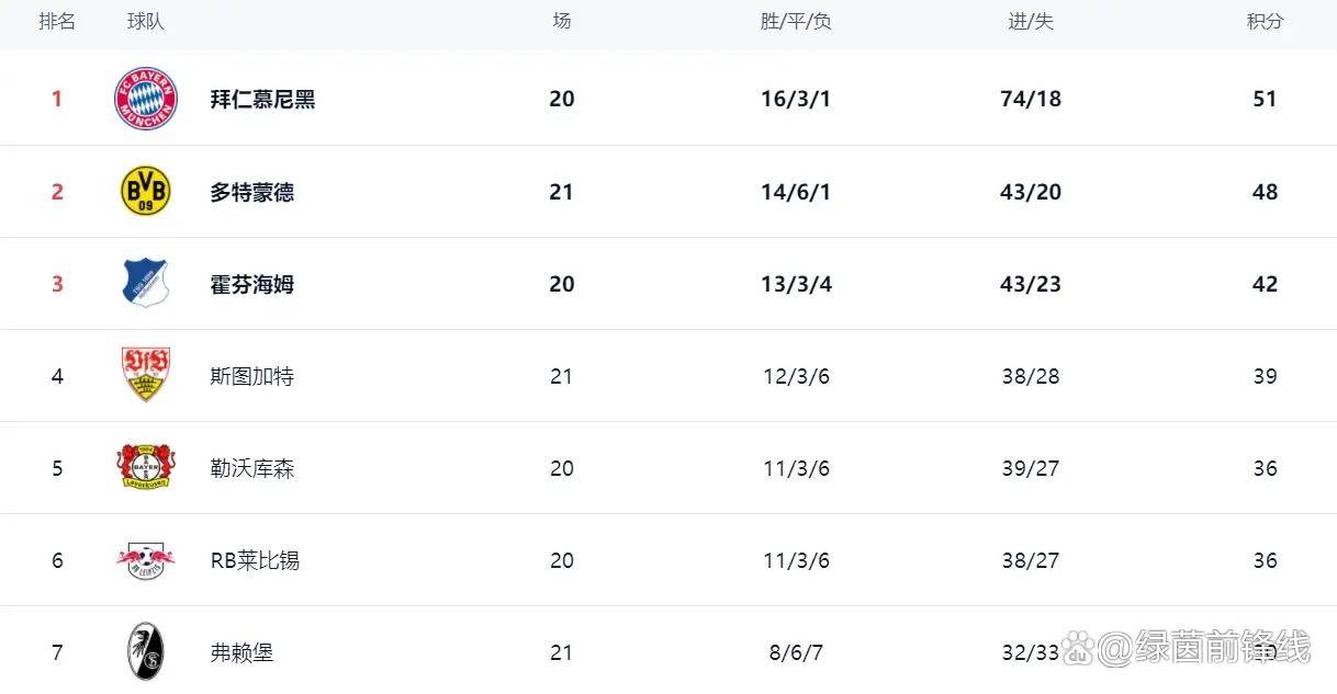 ที่จุดสูงสุดของตารางคะแนน บาเยิร์น มิวนิค ยังคงนำเป็นจ่าฝูงด้วยคะแนน 51 คะแนน สถิติชนะ 16 นัด เสมอ 3 นัด และแพ้ 1 นัด เป็นเครื่องพิสูจน์ถึงความเหนือชั้นของพวกเขา อย่างไรก็ตาม ความนำนี้ไม่ได้มั่นคงอีกต่อไป เมื่อโบรุสเซีย ดอร์ทมุนด์ กลายเป็นม้ามืดที่ไล่ตามอย่างใกล้ชิด ทำให้บาเยิร์นต้องเผชิญกับแรงกดดันที่ไม่เคยมีมาก่อน