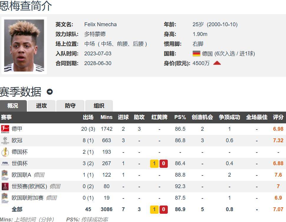 เอนเมชา อายุ 25 ปี สูง 1.90 เมตร เป็นกองหน้าตัวเป้าถนัดเท้าขวา สัญญากับโบรุสเซีย ดอร์ทมุนด์ หมดอายุในปี 2028 โดย Transfermarkt ประเมินมูลค่าไว้ที่ 45 ล้านยูโร ในฤดูกาลนี้ เอนเมชา ลงเล่นให้ดอร์ทมุนด์ไปแล้ว 40 นัดในทุกรายการ โดยเป็นตัวจริง 33 นัด ทำได้ 6 ประตู และ 3 แอสซิสต์